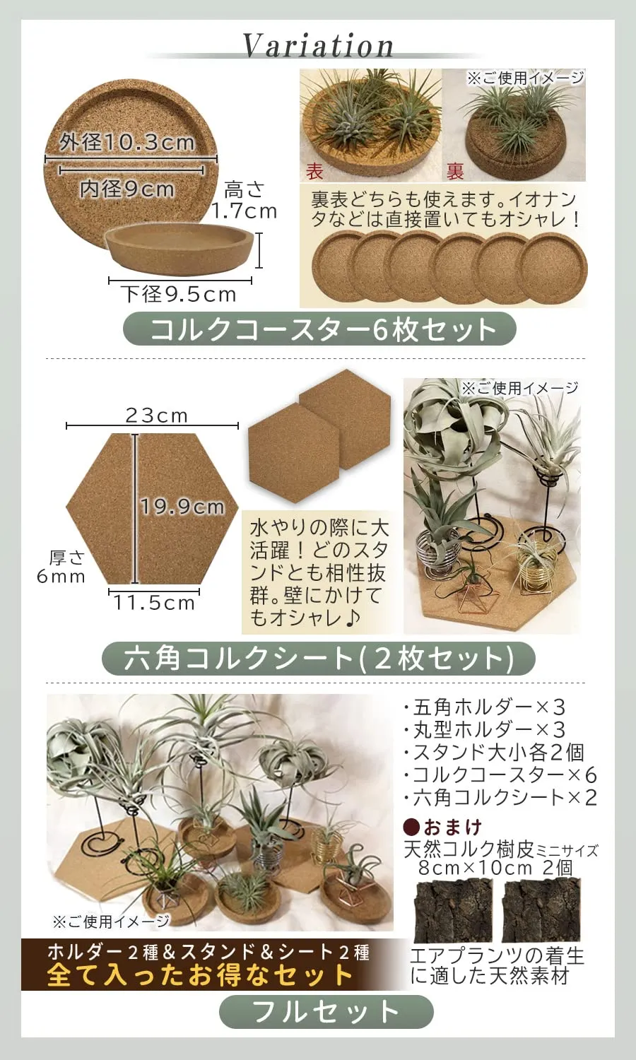 ●フルセット(五角ホルダー×3、丸型ホルダー×3、スタンド大小各2個、コルクコースター×6、六角コルクシート×2全て入ったお得なセット!天然コルク樹皮ミニサイズ2個のおまけつき