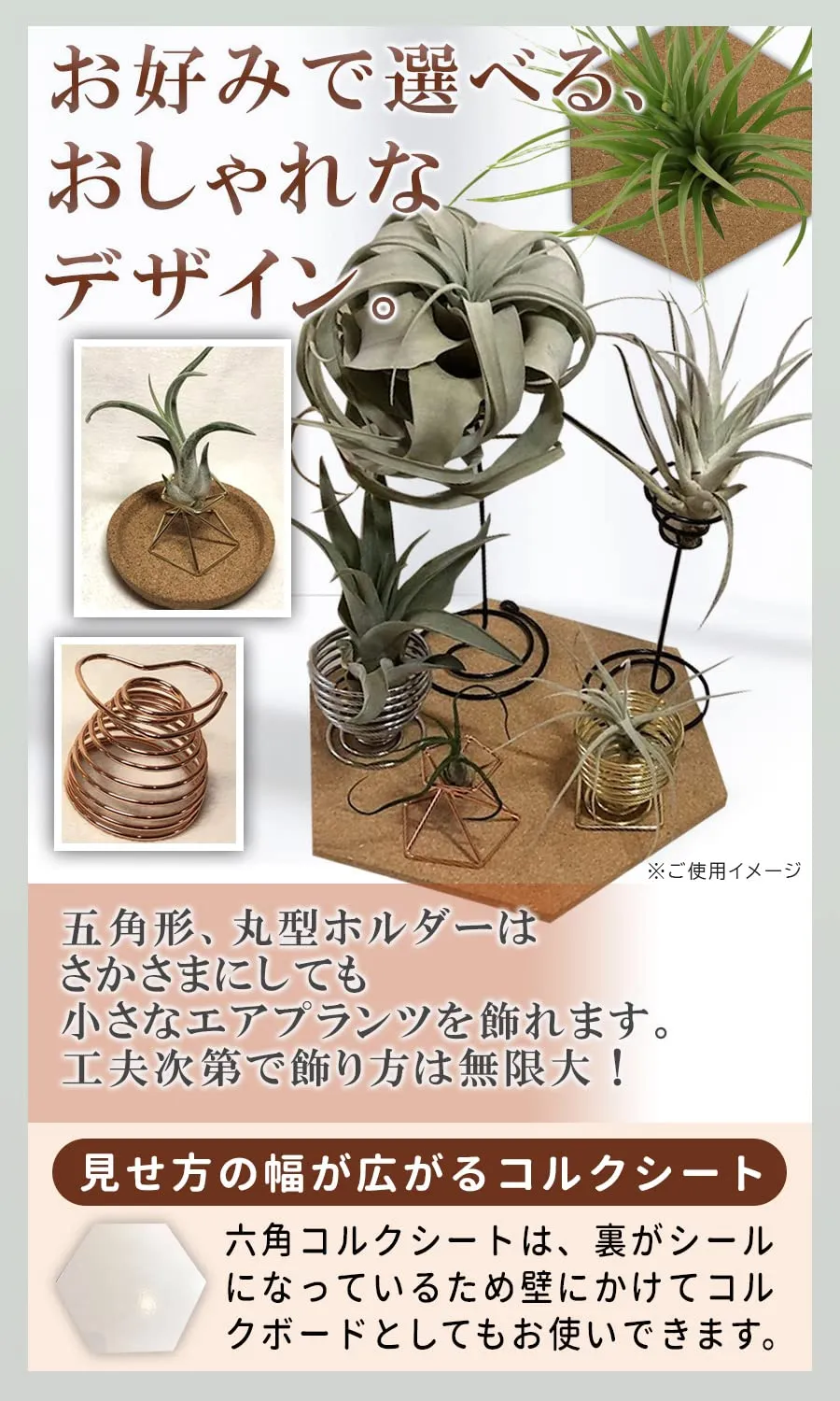 【見せ方の幅が広がるコルクシート】六角コルクシートは、裏がシールになっているため壁にかけてコルクボードとしてもお使いいただけます。壁にエアプランツを飾っても素敵なインテリアに。丸型のコルクコースターは裏表どちらも使えます。イオナンタなどは直接置いてもオシャレ!