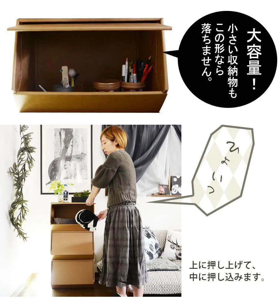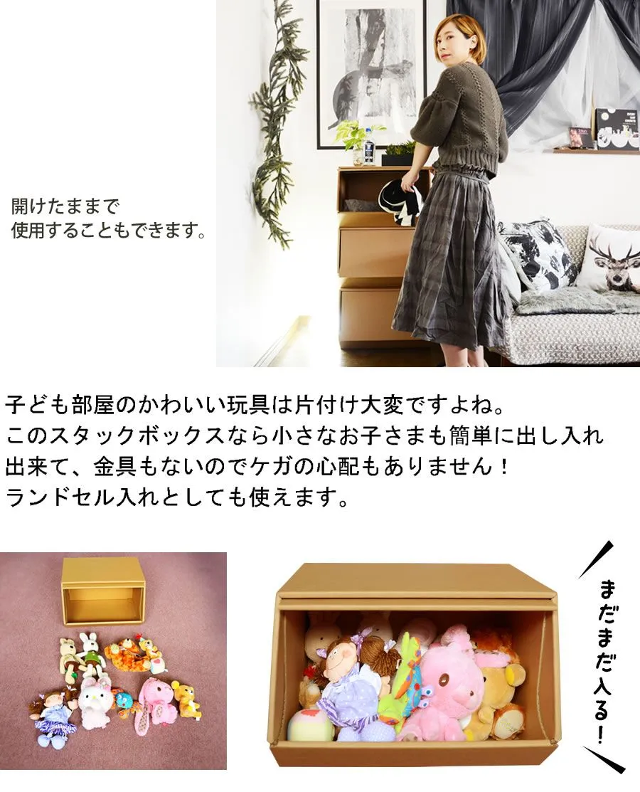 ■ スライド式の扉がフルオープンする大容量収納ボックスです。 子どもも安心して使える金具不使用!ダンボールの折り返しのみで作れます。 ナチュラルな色合いはリビングや子ども部屋にもピッタリ! 3段マルチラックと同じサイズですので組み合わせて使用すれば ランドセルラックや チェストとして使っていただくことも可能です。