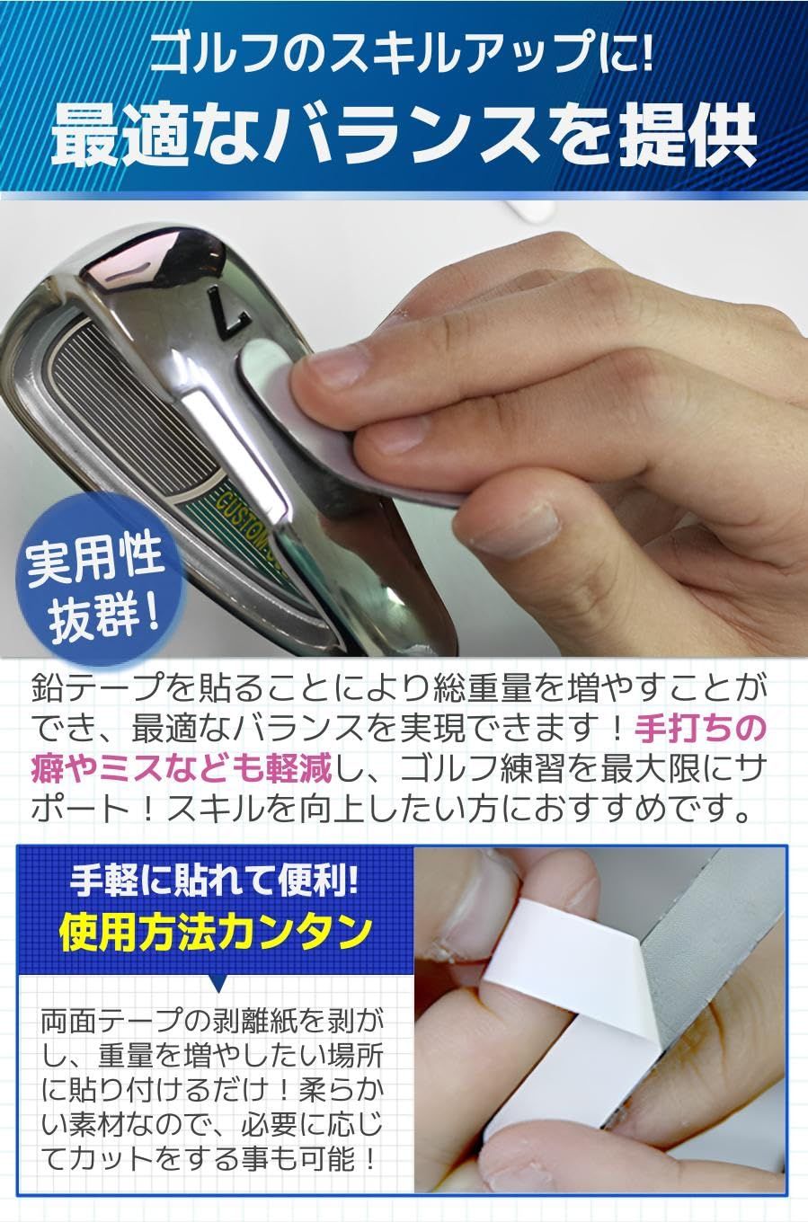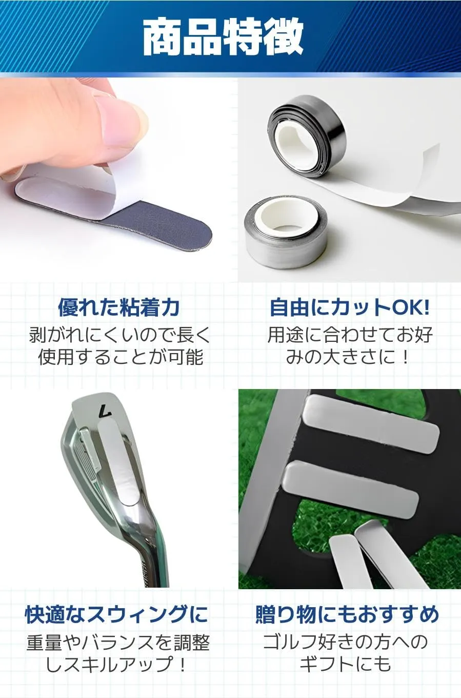 【商品特徴】①優れた粘着力:剥がれにくいので長く使用することが可能/②自由にカットOK!:用途に合わせてお好みの大きさに!/③快適なスウィングに:重量やバランスを調整しスキルアップ!/④贈り物にもおすすめ:ゴルフ好きの方へのギフトにも