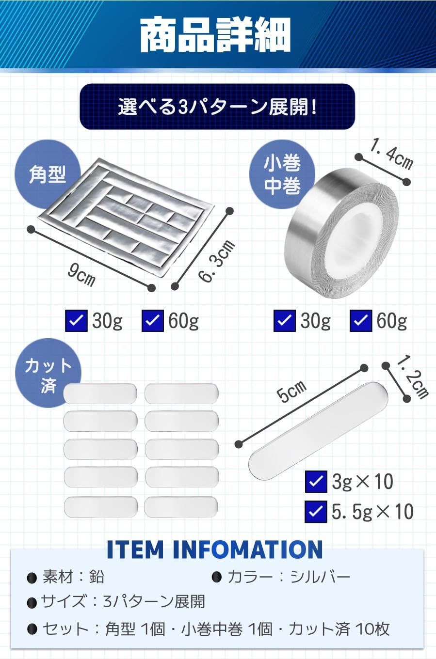 【商品詳細】素材:鉛カラー:シルバー/サイズ:3パターン展開/セット:角型 1個・小巻中巻 1個・カット済 10枚/ 最後までご確認頂き誠にありがとうございました。 ご確認頂き、ご購入いただけましたら幸いです。 何かご不明点などがございましたらお気軽にメッセージからお問い合わせ下さい。