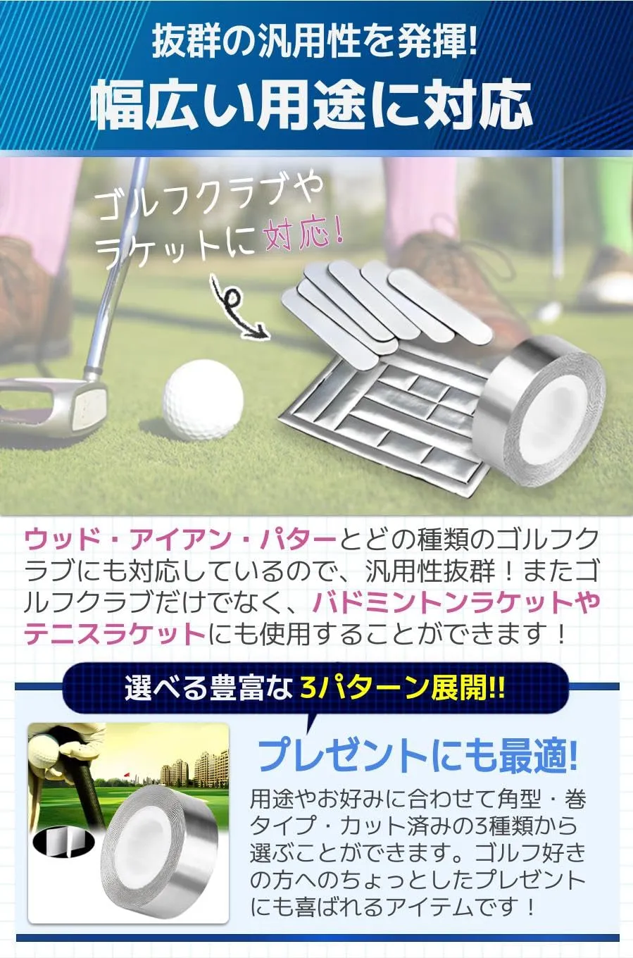 【プレゼントにも最適!】用途やお好みに合わせて角型・巻タイプ・カット済みの3種類から選ぶことができます。ゴルフ好きの方へのちょっとしたプレゼントにも喜ばれるアイテムです!