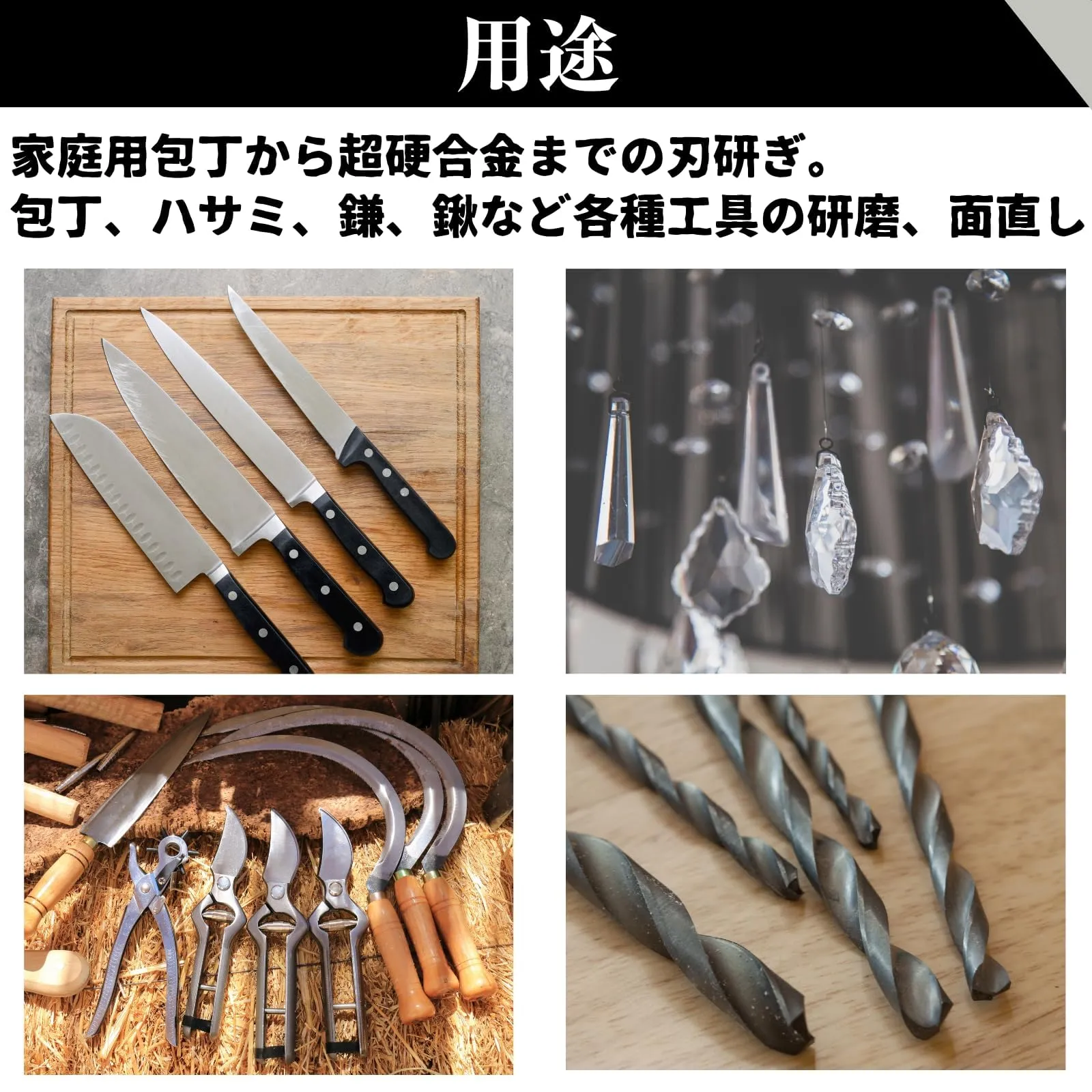 【用途】家庭用包丁から超硬合金までの刃研ぎ。板前、大工、理美容師、刀鍛冶、農具など、ノミ、カンナ、ドリルビット、包丁、ハサミ、鎌、鍬など各種工具の研磨、面直しや修正砥石としても使用可能。