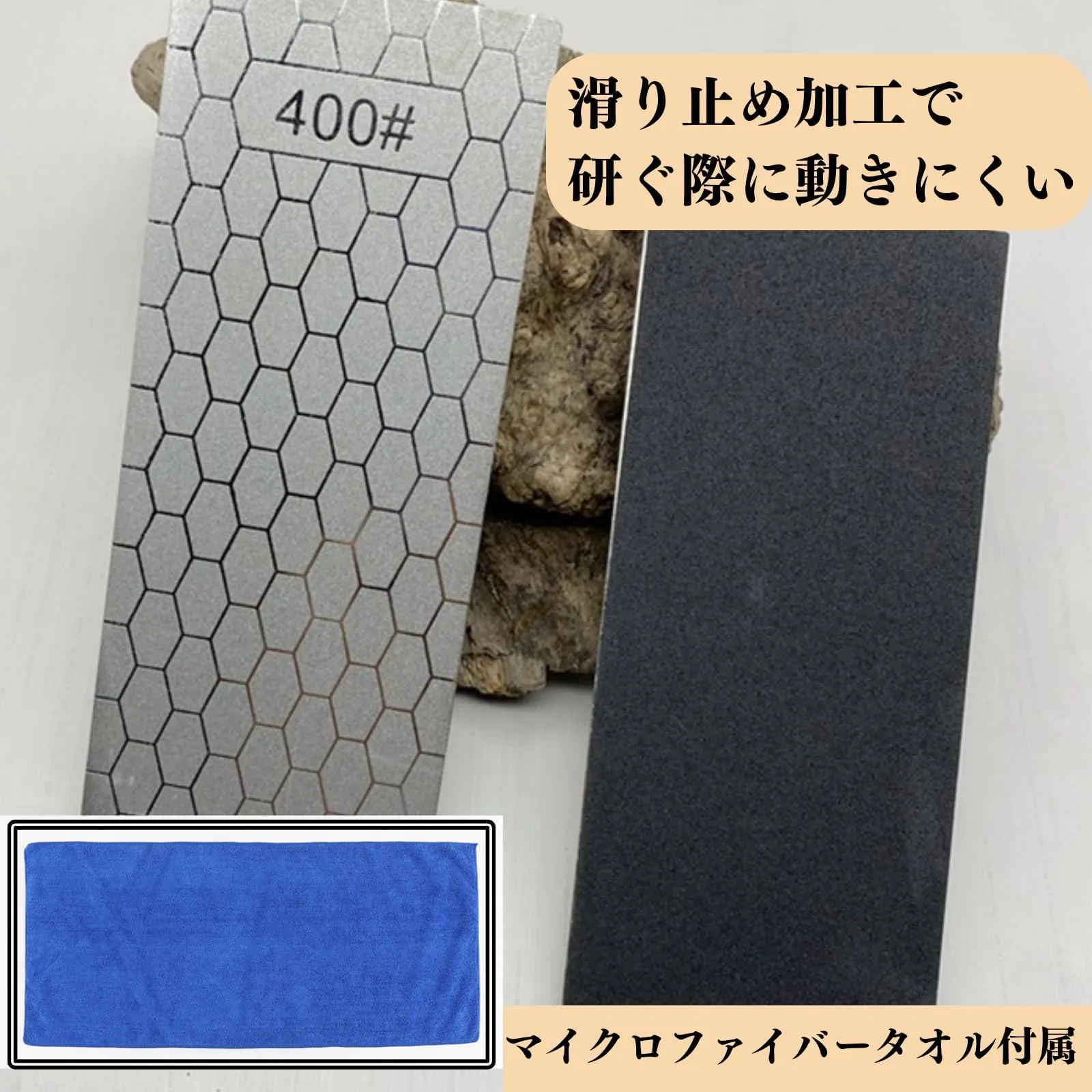 【滑り止め付き】砥石の裏面には滑り止めの加工が施されており、研ぐ際に動きにくいです。砥石の手入れや作業後の清掃に便利なマイクロファイバータオル付属。