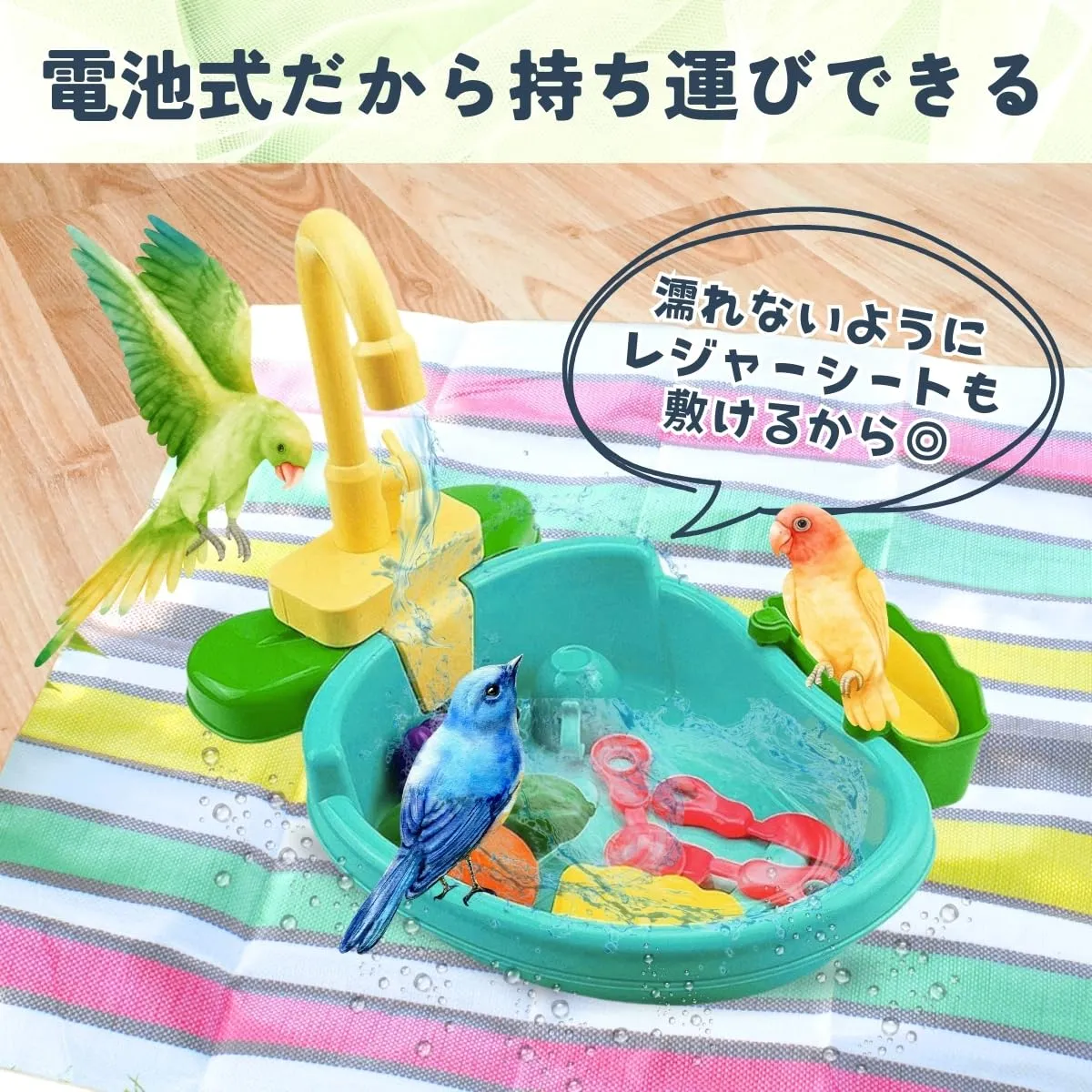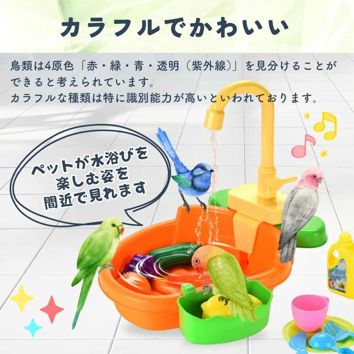 【自動シャワー機能で手軽に水浴び】 鳥専用の水浴び容器は、自動シャワー機能で蛇口から水を循環させ、鳥が自分で楽しく水浴びできる設計です。スイッチ一つで作動し、電池式なのでどこでも手軽に設置可能です。セキセイインコ、文鳥、カナリアなどの小型の鳥にぴったりで、毎日の健康管理やリラクゼーションをサポートします。モーター音に初めは驚くかもしれませんが、慣れると安心して遊ぶようになります。