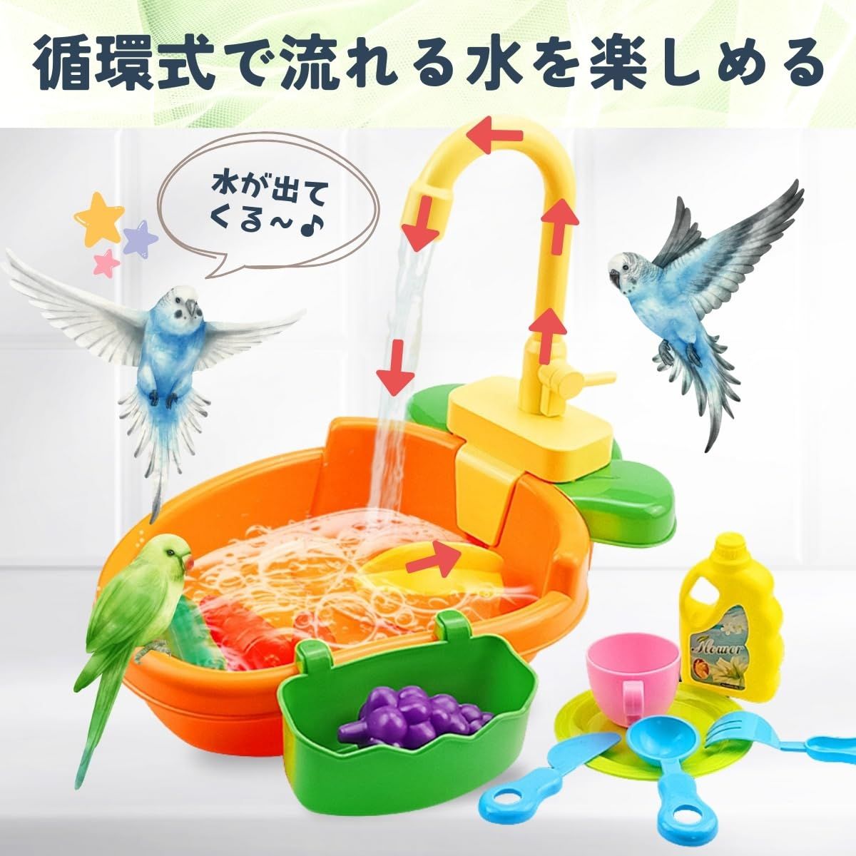 【節水効果のある水循環システム】 この鳥用水浴び容器は、少量の水でも効率よく使用できる水循環システムを採用しています。蛇口から出る水が自動的に循環し、鳥が楽しく水浴びできる環境を提供します。節水設計により、水の浪費を抑え、エコなライフスタイルをサポートします。また、水の追加や出しっぱなしの心配もなく、水替えの手間を減らして経済的に使用できます。