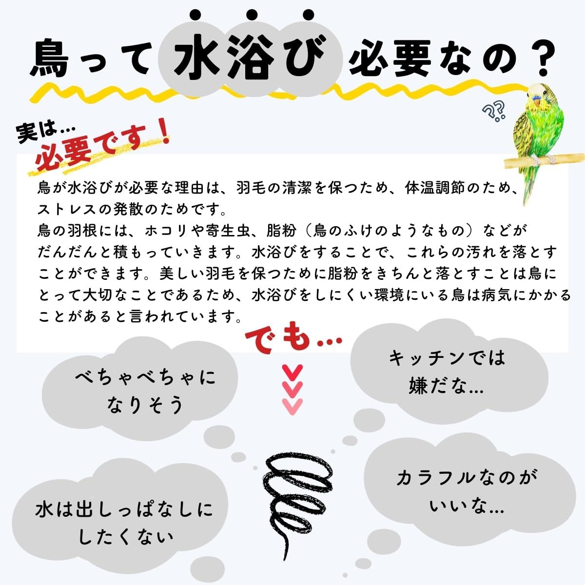 【ストレス解消と遊びの時間に最適】 鳥が自ら水浴びを楽しむことで、ストレス解消やリラックス効果が得られます。入浴は、清潔さを保つだけでなく、精神的な刺激や運動の一環としても重要です。さらに、付属の小さなおもちゃアクセサリーを使えば、鳥がより楽しめる環境を提供できます。