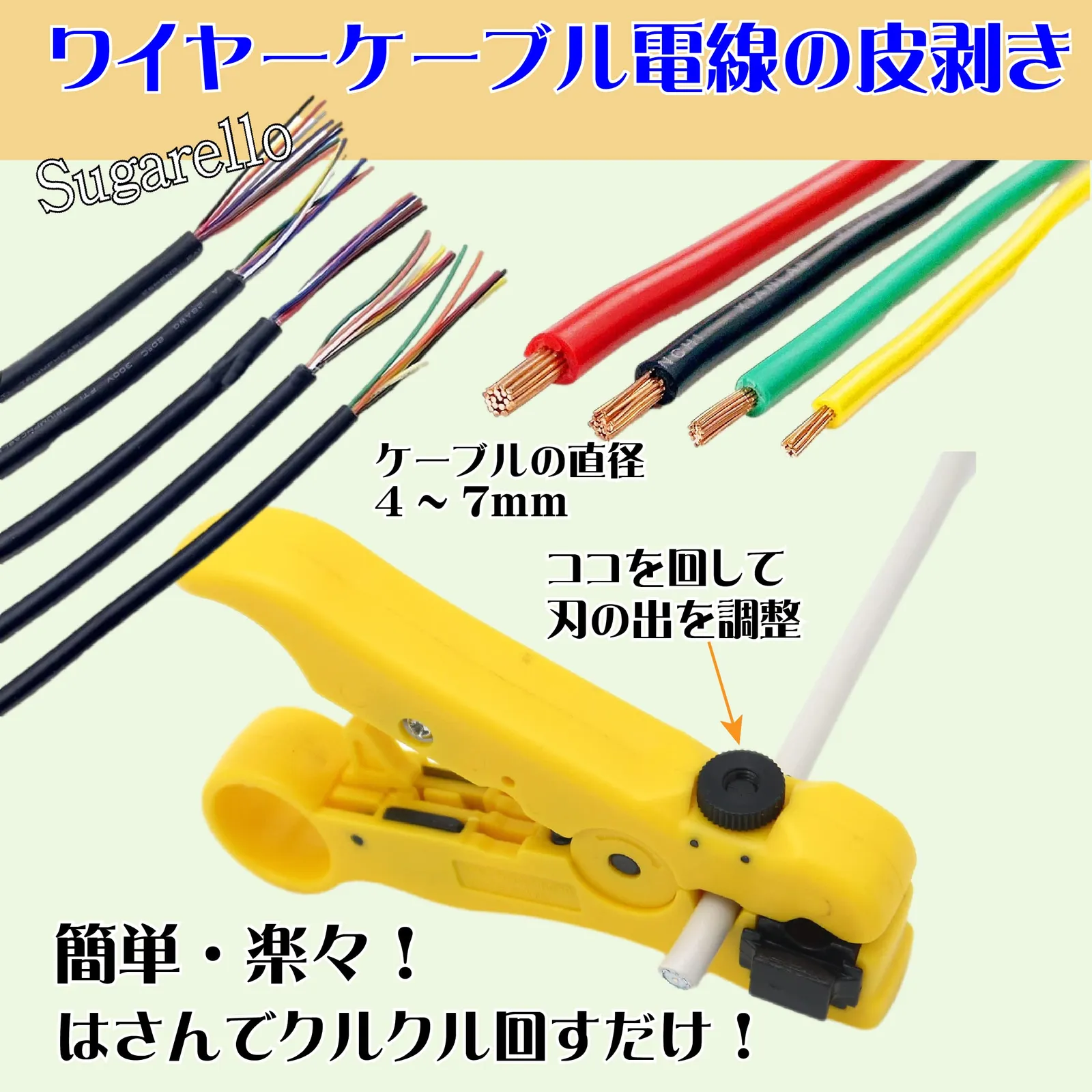 ワイヤーケーブルストリッパー。電線ケーブルの皮剥きに使えます。刃の出を調整して直径約4mm~7mmのケーブルに対応します。使い方は簡単!挟んでくるくる回すだけです。