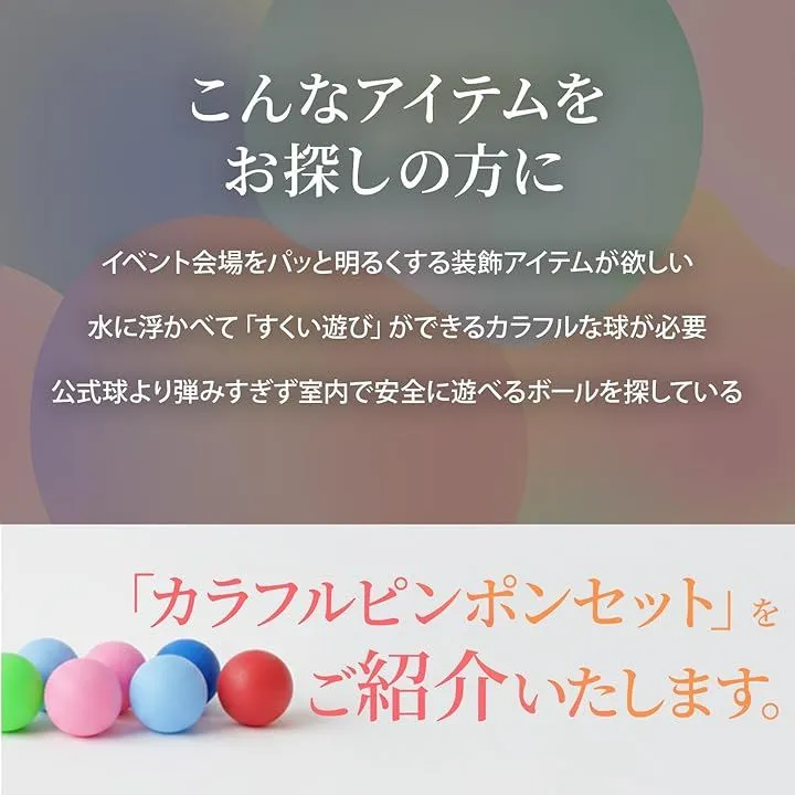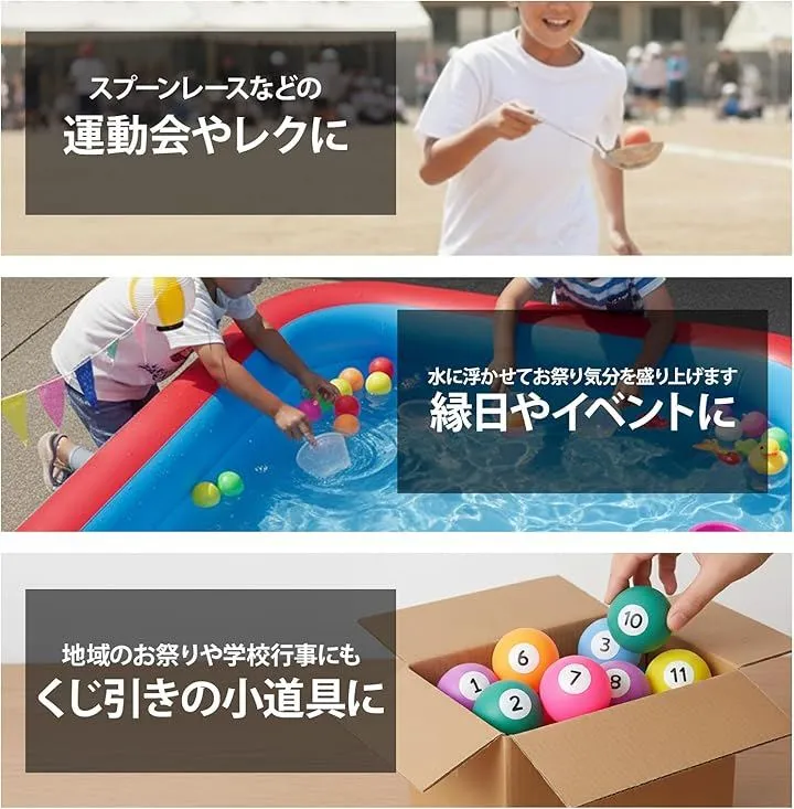 「イベントに最適なカラー」カラフルなピンポン玉が会場を明るく彩り、くじ引きやビンゴなどの娯楽イベントに最適です。