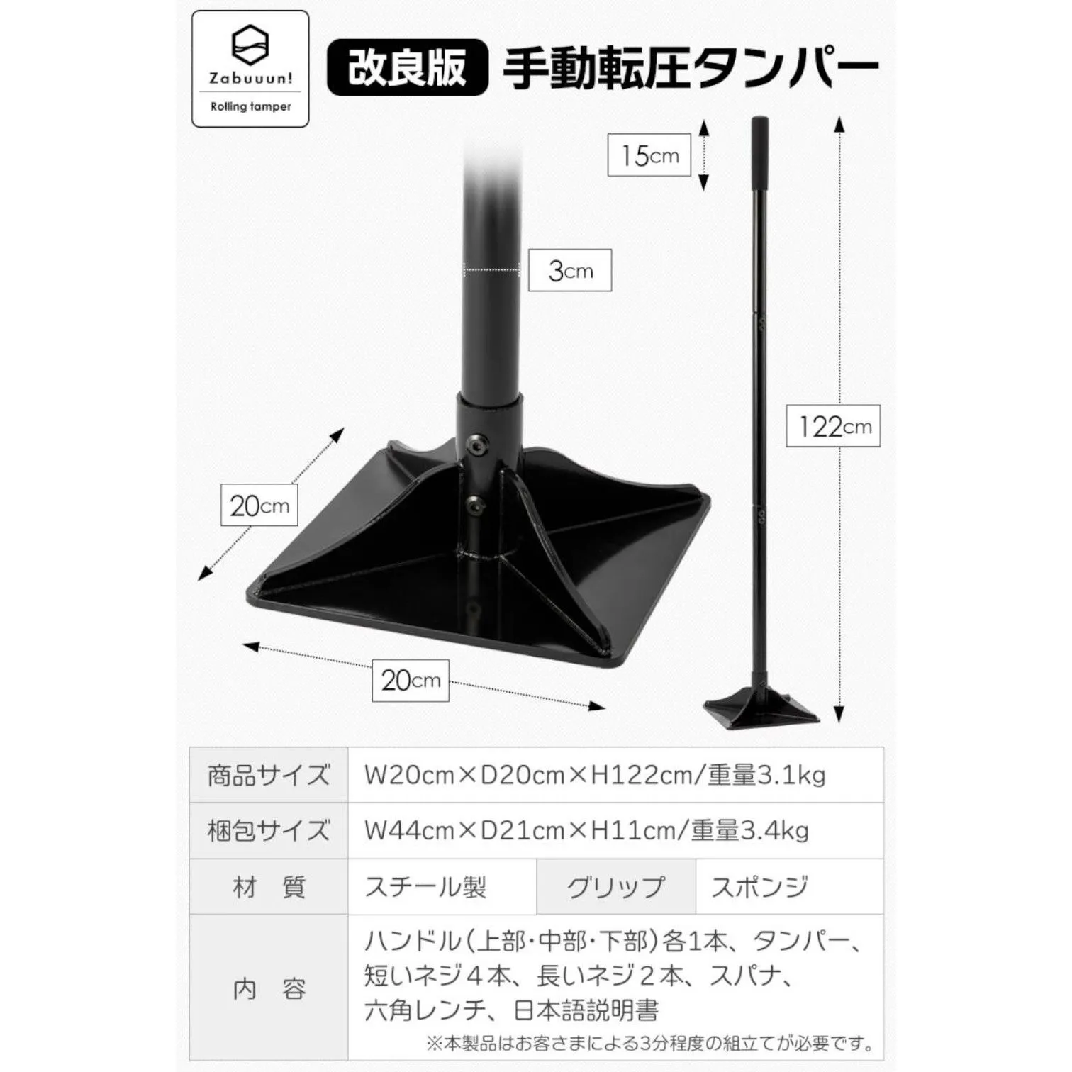 #3046 改良版 転圧 タンパー スチール製 122cmハンドル付(プレート面 20cmx20cm) 小型 手動転圧機 ハンドル付き 整地 ランマ 転圧プレート ※一部地域離島別途配送料有