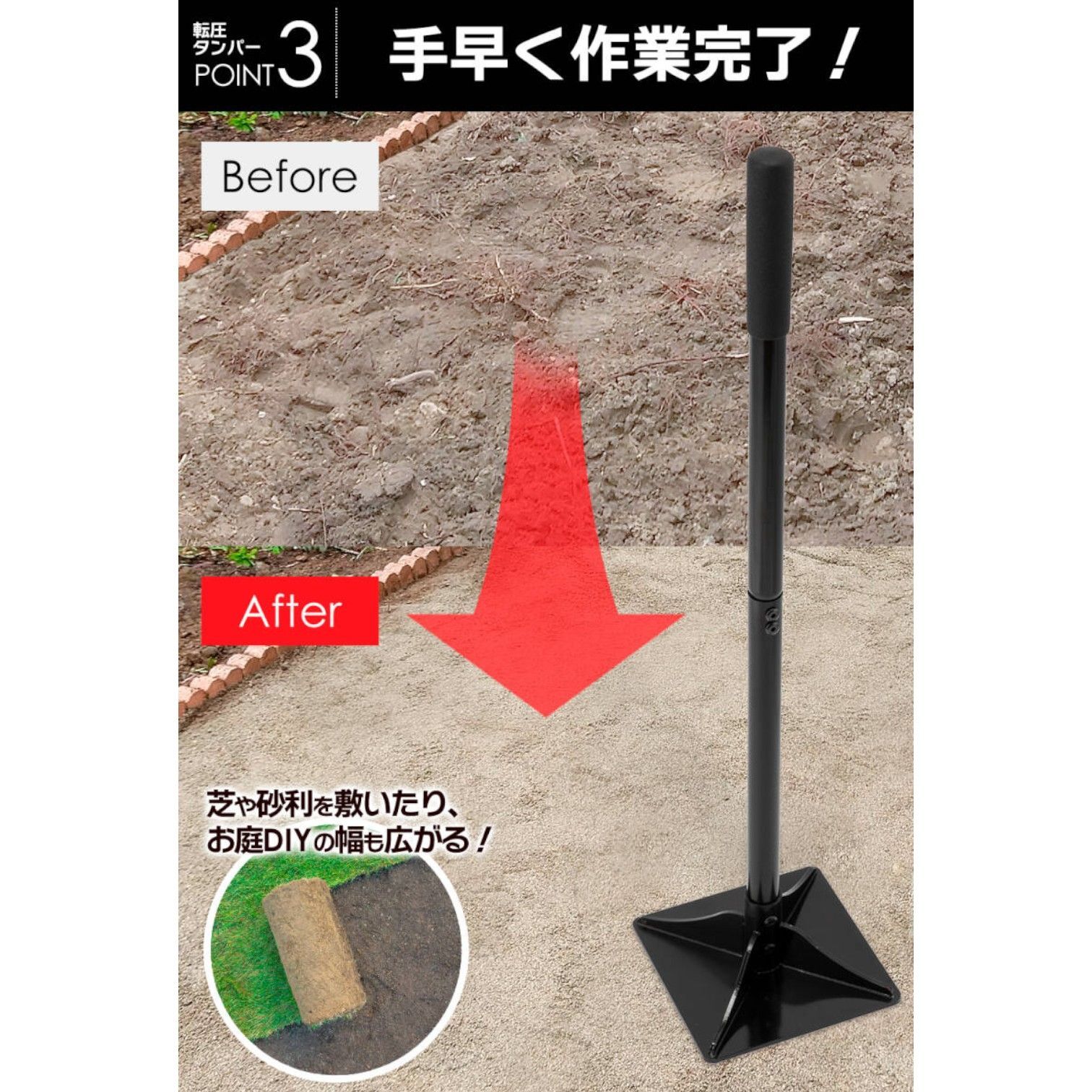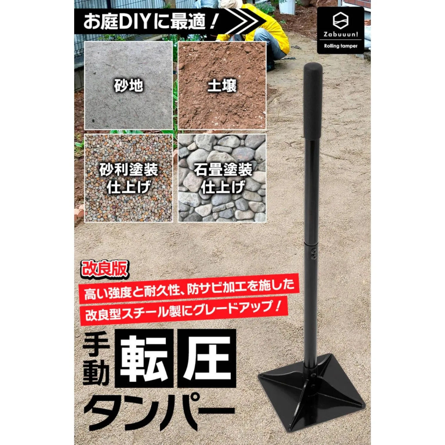 ■幅広い用途に対応 アスファルト、砂利、土、石、コンクリートなどの転圧に使用可能です。 庭づくりや舗装、DIY、補修作業など、さまざまなシーンで活躍します。