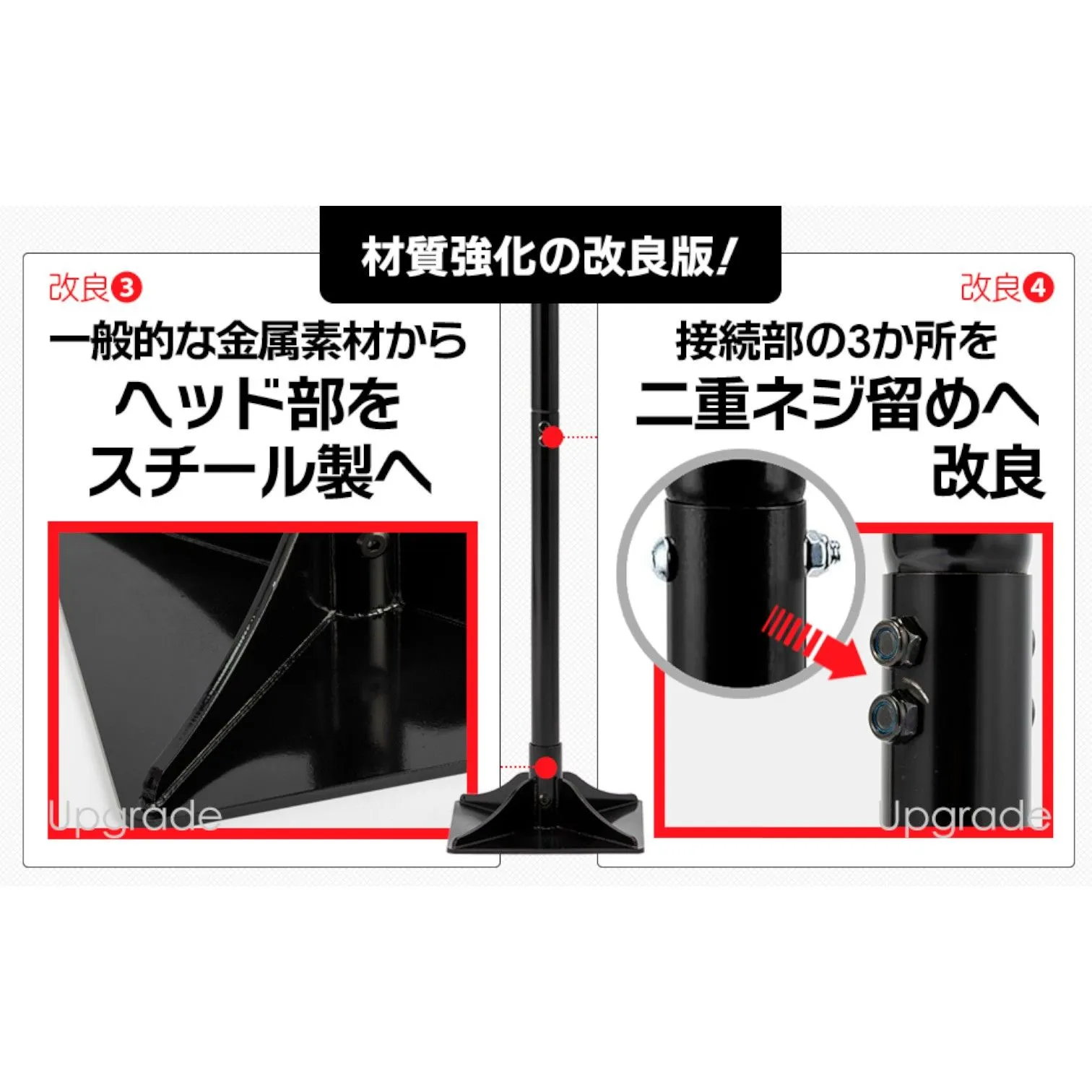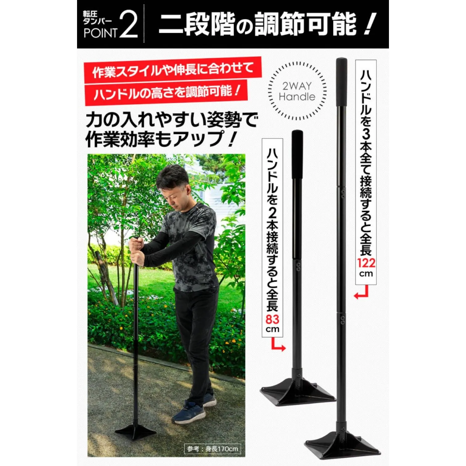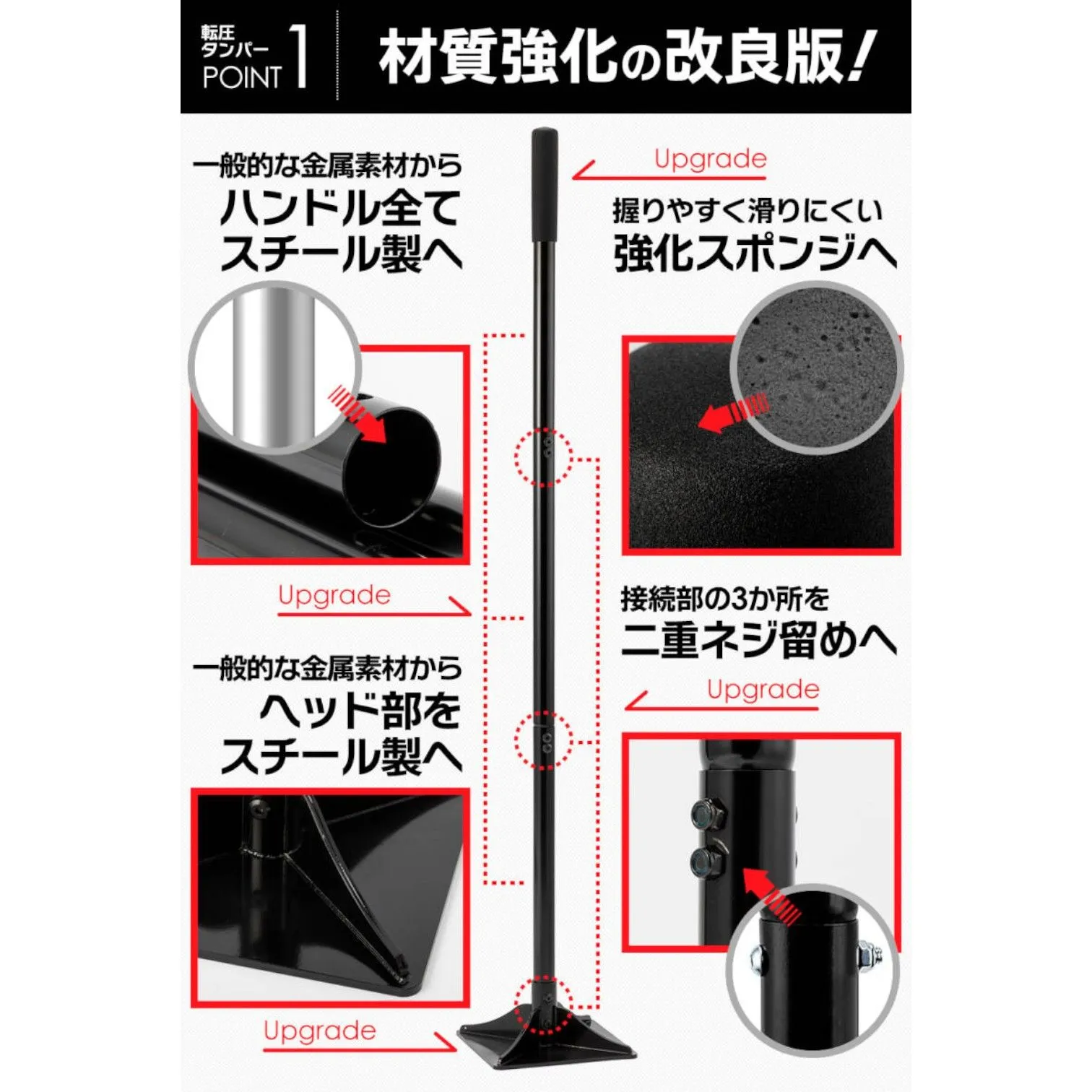 ■頑丈で耐久性の高い構造 20cm×20cmのスチール製ヘッドを採用し、しっかりとした重量で安定した転圧が可能です。 パウダーコーティング仕上げにより、錆びにくく長く使用できます。