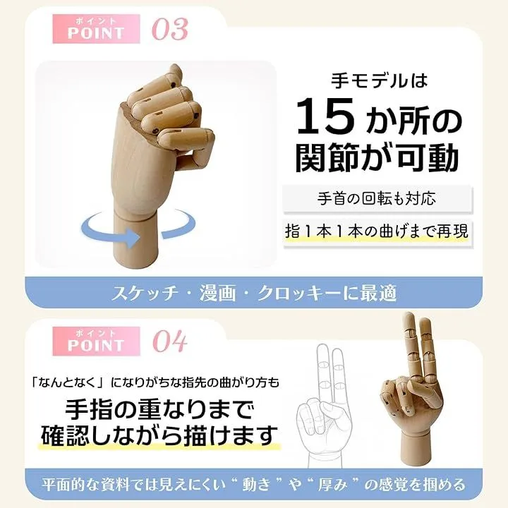 「手指の重なり方まで確認することができる手モデル」15箇所の関節が可動可能で、平面的な資料では見えにくい”動き”や”厚み”の感覚を掴むことができます。