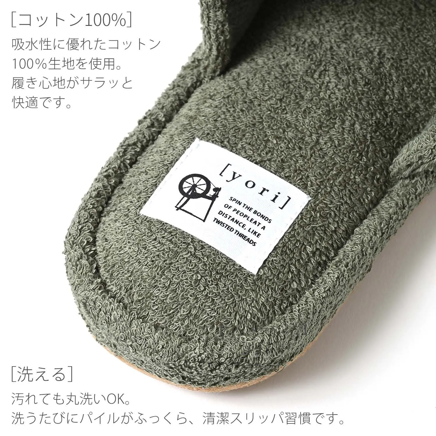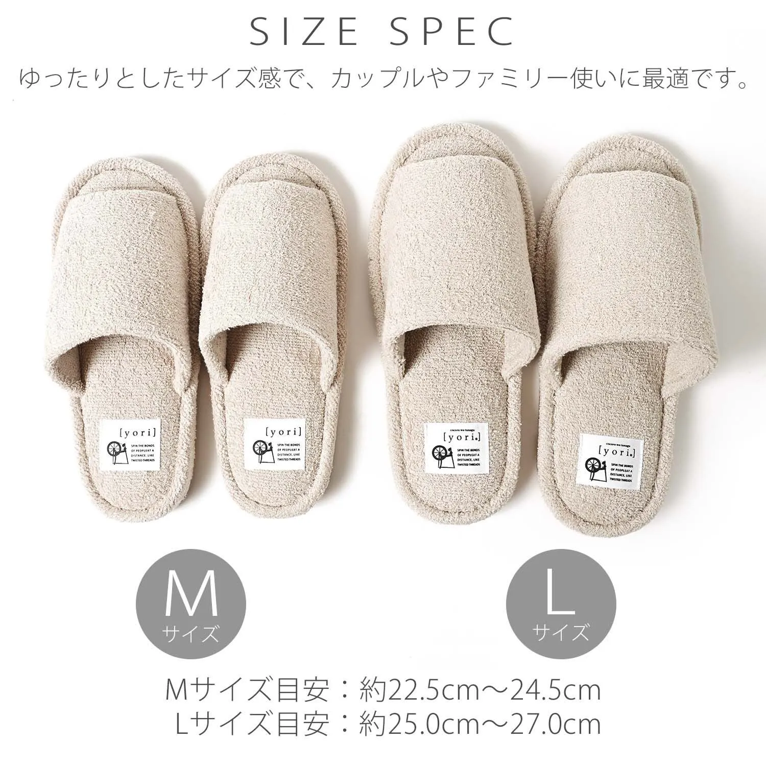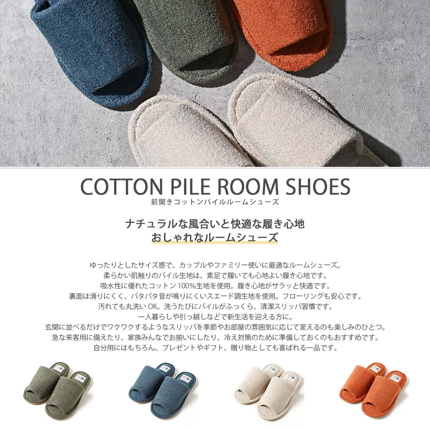 ●商品説明 快適な履き心地とナチュラルな風合いがおしゃれなルームシューズ。 ゆったりとしたサイズ感で、カップルやファミリー使いに最適です。 [パイル生地]柔らかい肌触りのパイル生地は、素足で履いても心地よい履き心地です。長時間、素足で着用しても付け根部分が痛くなりにくく快適に過ごせます。 [コットン100%]吸水性に優れたコットン100%生地を使用。履き心地がサラッと快適です。 [スエード]裏面は滑りにくく、パタパタ音が鳴りにくいスエード調生地を使用。フローリングも安心です。 [洗える]汚れても丸洗いOK。洗うたびにパイルがふっくら、清潔スリッパ習慣です。 一人暮らしや引っ越しなどで新生活を迎える方に。 玄関に並べるだけでワクワクするようなスリッパを季節やお部屋の雰囲気に応じて変えるのも楽しみのひとつ。 急な来客用に備えたり、家族みんなでお揃いにしたり、冷え対策のために準備しておくのもおすすめです。 自分用にはもちろん、プレゼントやギフト、贈り物としても喜ばれる一品です。