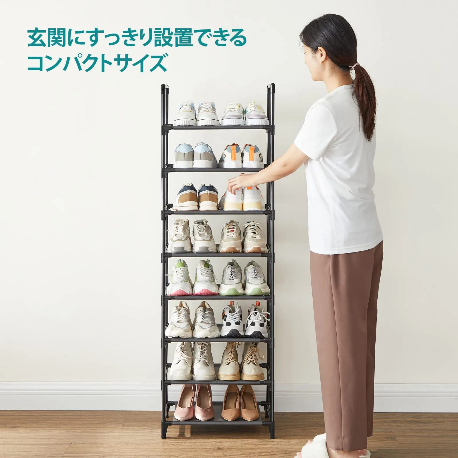 【組立簡単】 スチールパイプをジョイントに差し込むだけで、女性一人でも、簡単にできます(説明書付き) 。棚はハイヒール、バレリーナ、子供用の靴などいろんな靴に十分なスペースを提供します