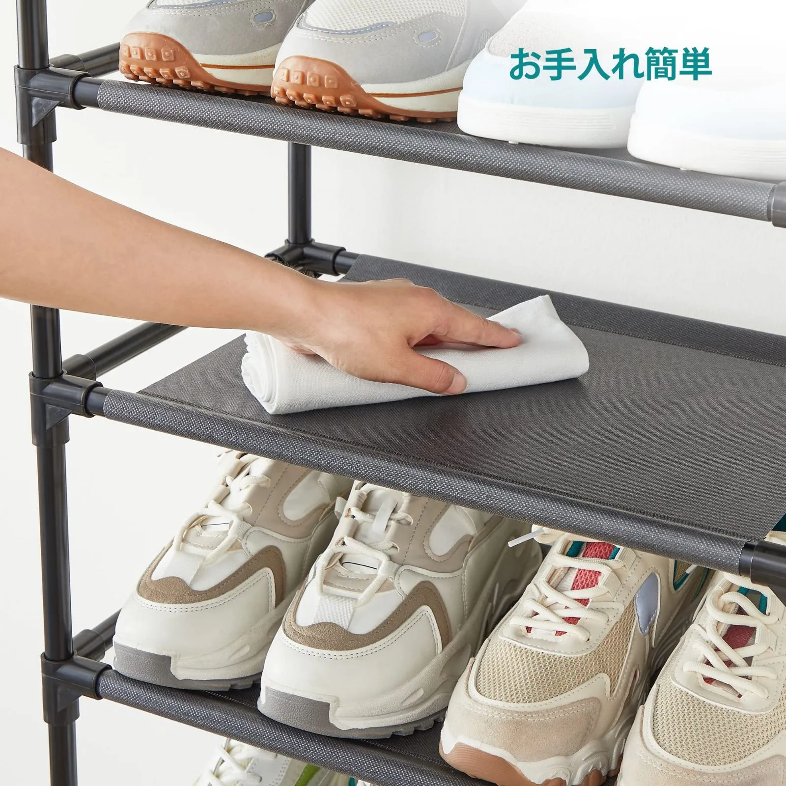 【良い素材を使用】より肉厚なスチールパイプは錆びにくく、耐摩耗性抜群です。PPフィルムで強化した不織布棚は、通気性に優れて、防水もできます。普段のお手入れが簡単になります。シューズラック底部は床からも約5cm離れているので、湿気やホコリ等がつきにくいです