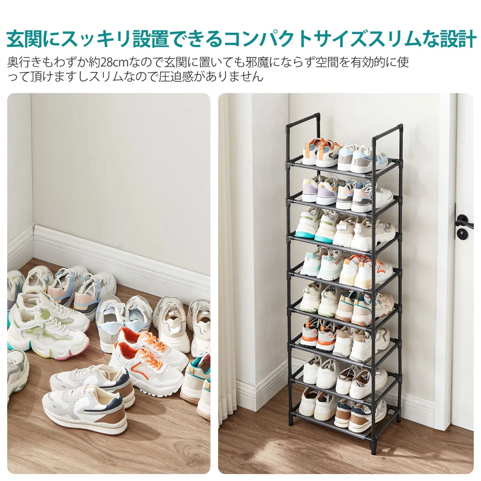 【スリムなのに大容量収納】奥行き28cmとスリムなので、限られたスペースの玄関でも、空間を圧迫せずにたくさんの靴を収納できます。扉や壁がないので通気性も良く、湿気やニオイがこもりません。大人の靴は16~20足も収納できます
