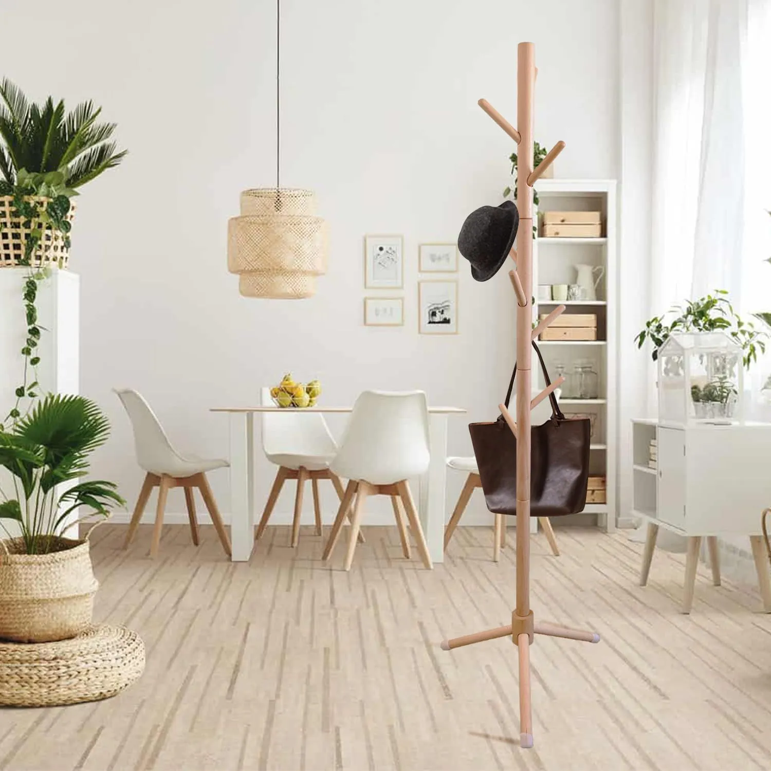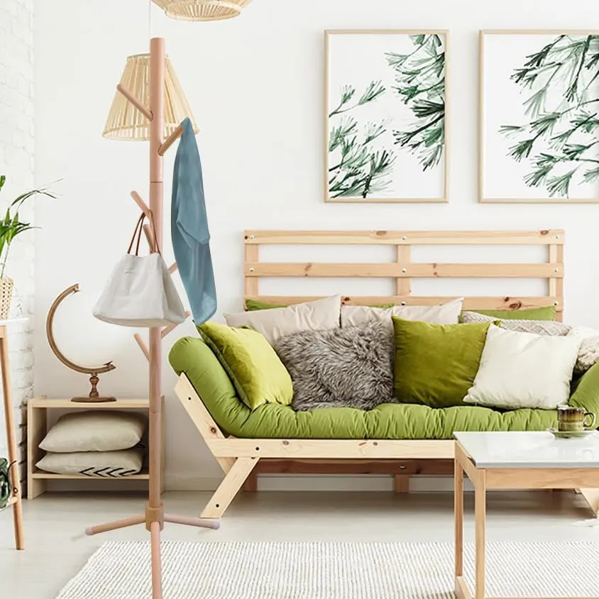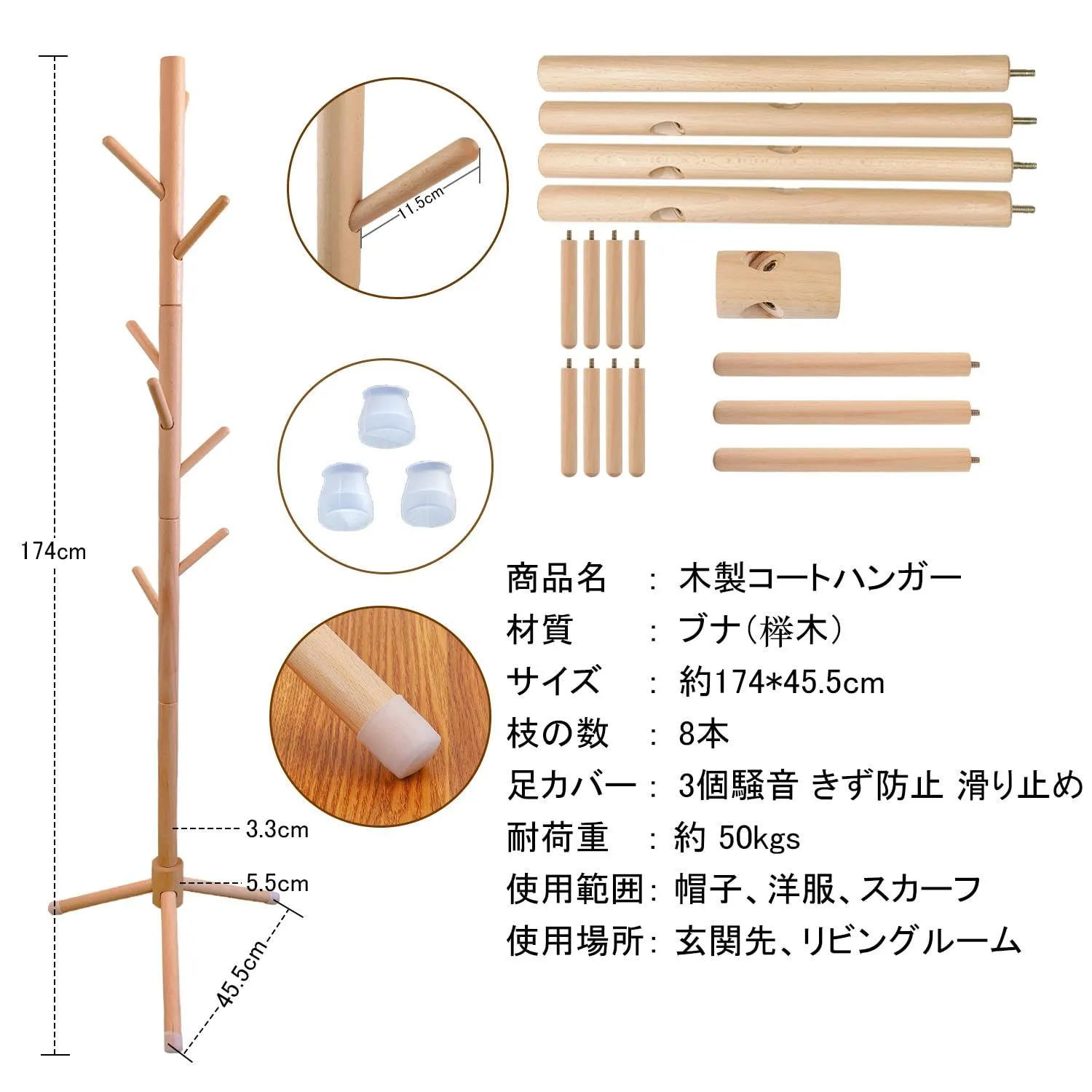 【商品仕様】ポールハンガー 木製 高さ:約174cm 台座の幅:約45cm 枝の数:8本,重量:約2kg。材質:ソリッド・ウッド。耐荷重:フック一個あたり6kg/全体で50kgまで。足に緩衝材がついていて、滑りや床の損傷を防ぐことができます。