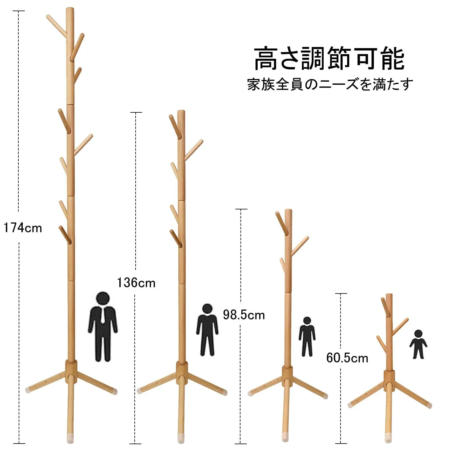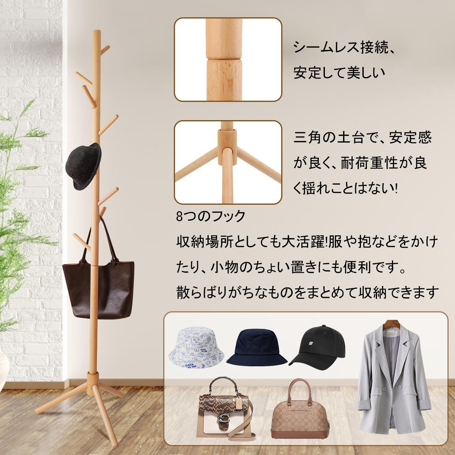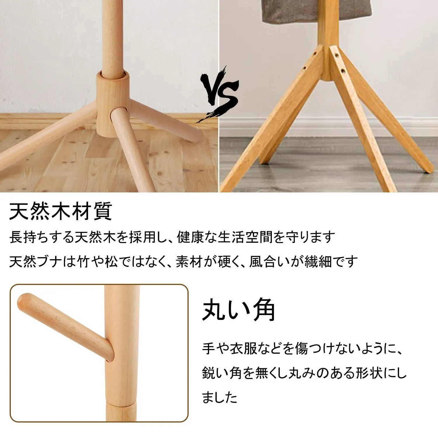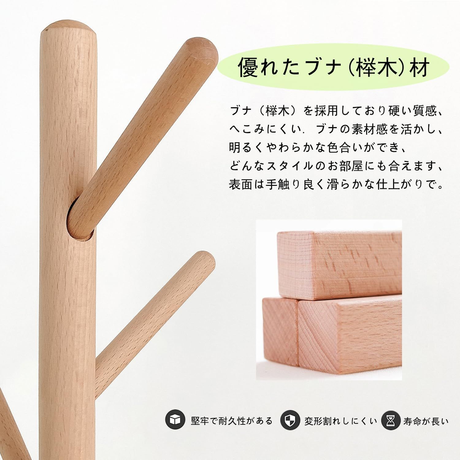 【天然木の質感】 材料は、柔らかい松ではなく、より高価な硬くて滑らかなブナです。天然の木を加工して出来たポールハンガーですので、表面は手触り良く滑らかな仕上がりで、丈夫である。環境に優しい塗装、ホルムアルデヒドなし。樹木の外観は自然の美しさを持っています。