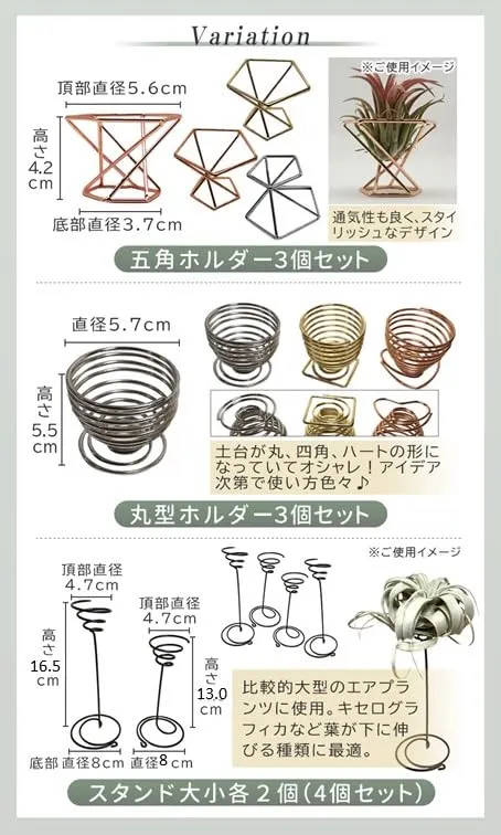 【お好みで選べる、おしゃれなデザイン】五角形、丸型ホルダーはさかさまにしても小さなエアプランツを飾れます。工夫次第で飾り方は無限大!丸型ホルダーは土台が丸、四角、ハートになっており、アイデア次第で色々な使い方ができます。