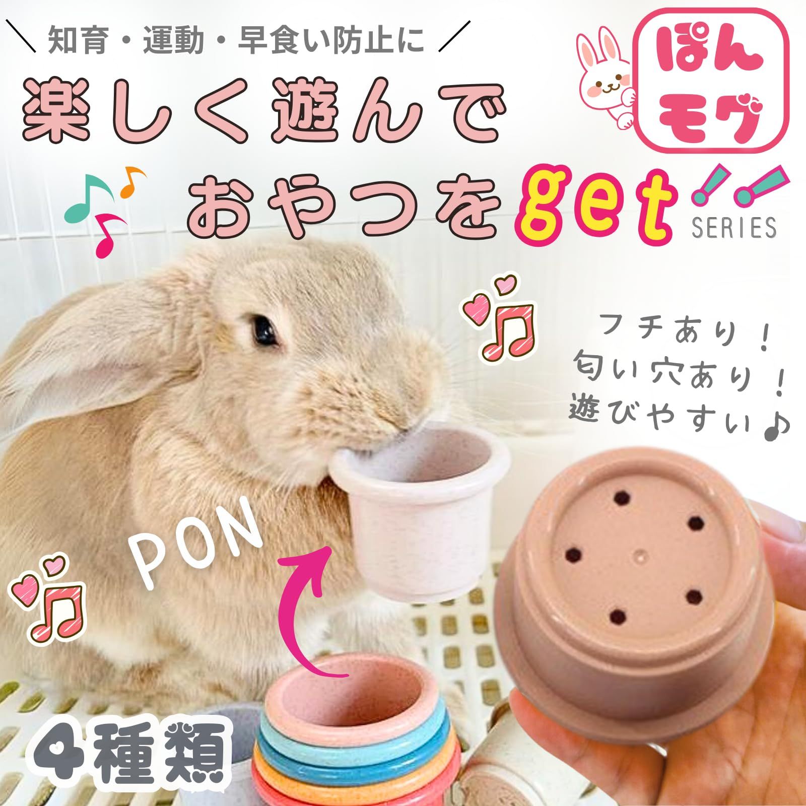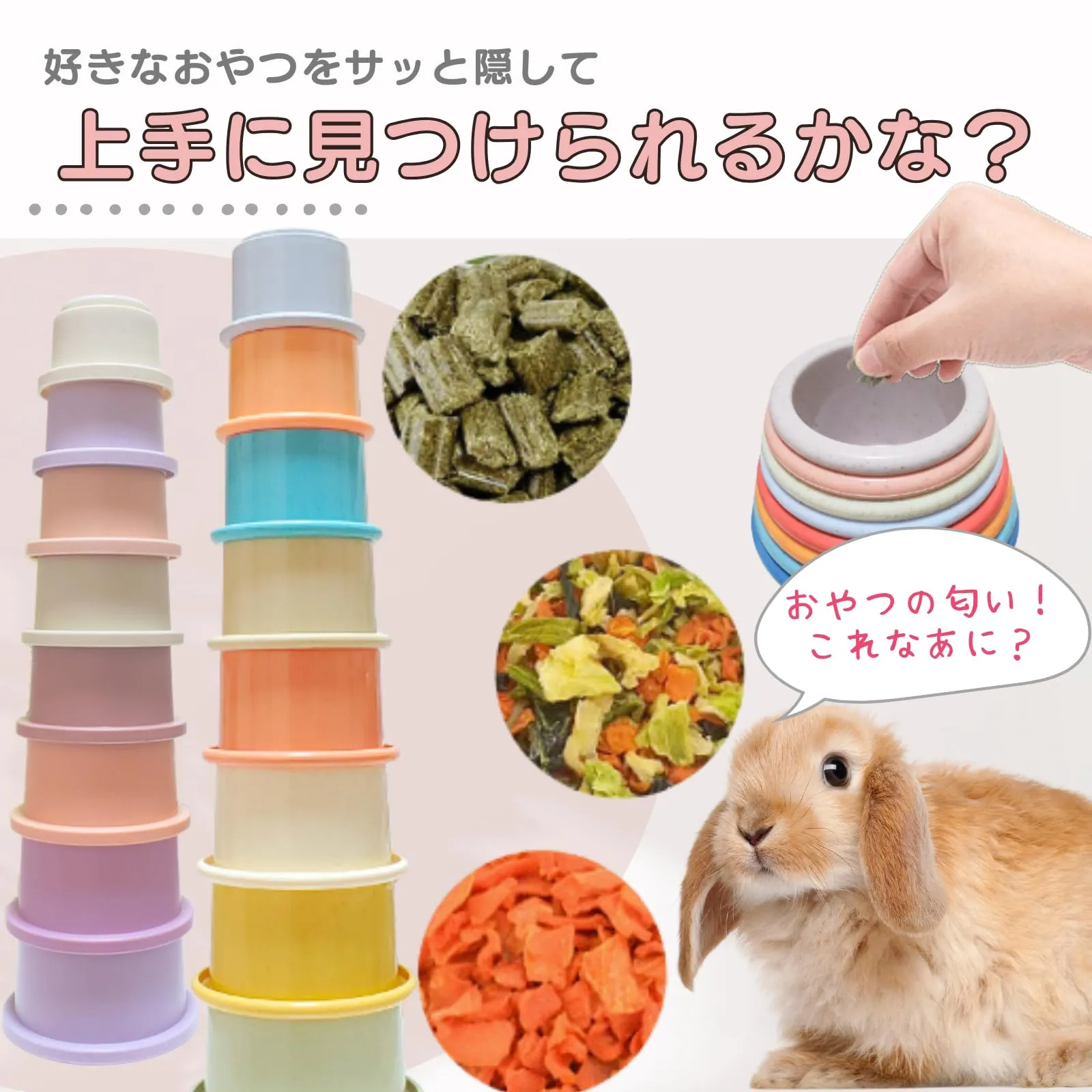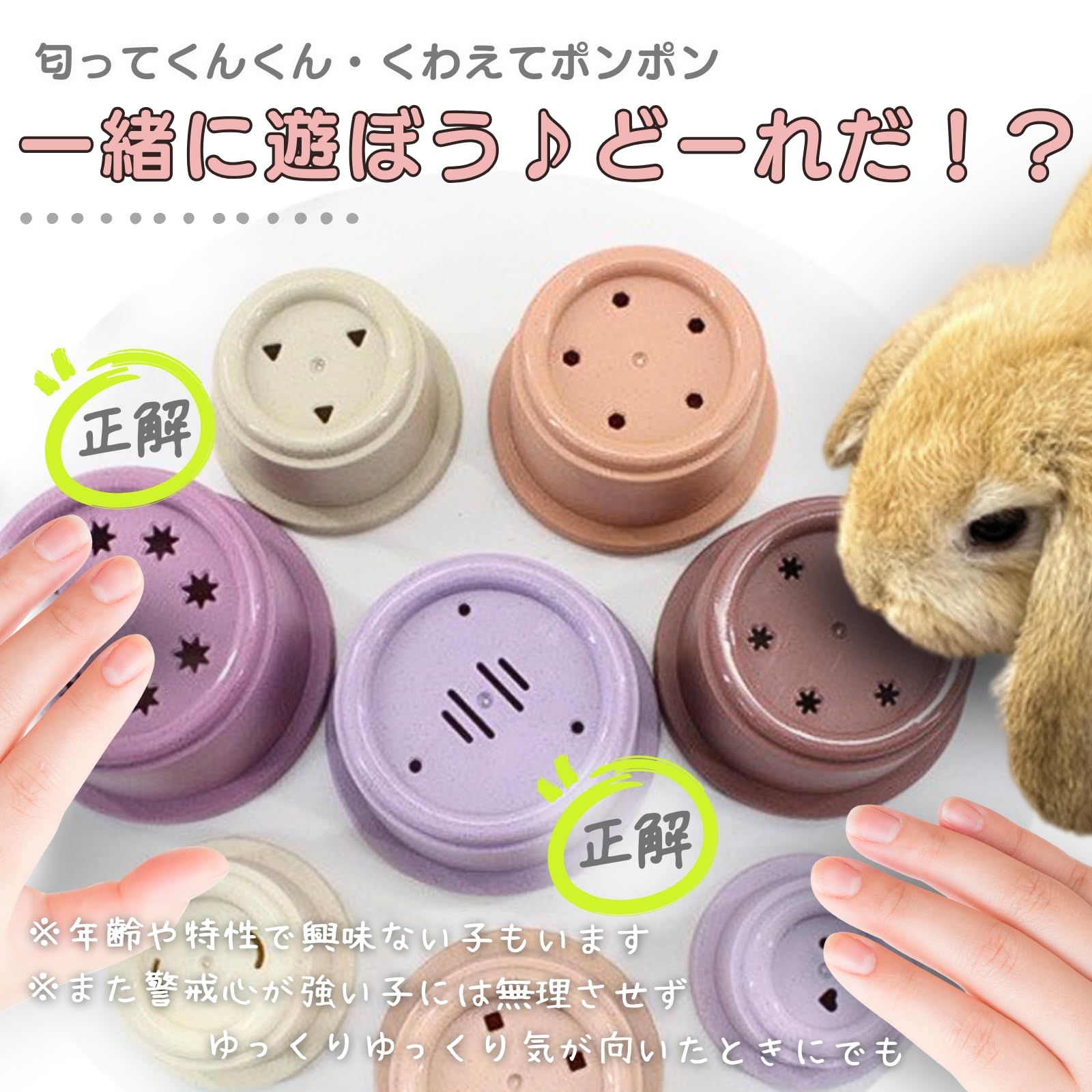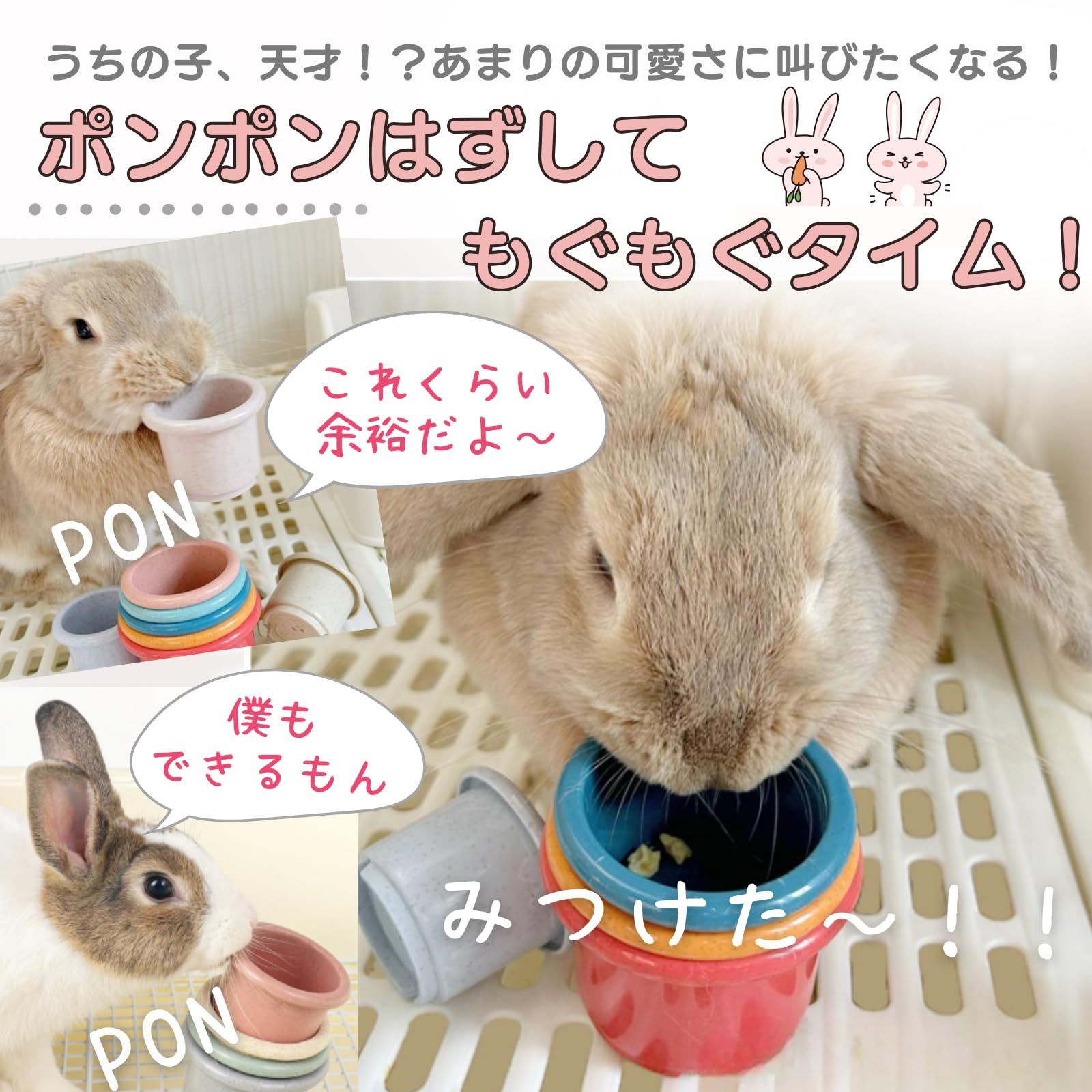 【楽しく遊んでおやつをGET!】カップの中におやつを入れて、兎さんが咥えてカップを外すことで大好きなおやつを見つけることができます。遊ぶ楽しさ、見つける喜び、ぽんぽんモグモグと、とても可愛いです♪ ?