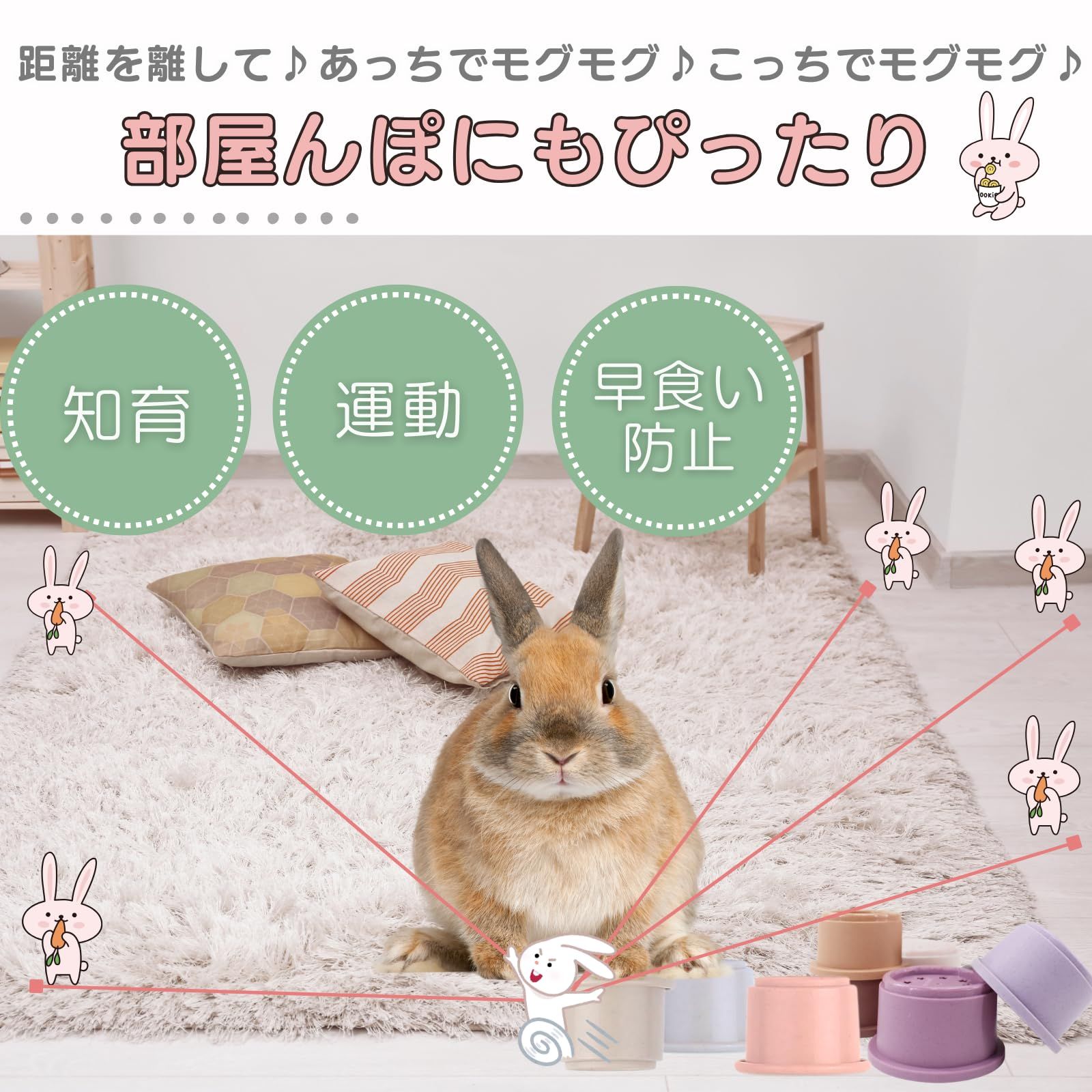 【部屋んぽにもぴったり】カップを少し離して置くと、ウサギさんが探しながら遊べます。運動や早食い防止にもなり、部屋んぽタイムやおやつタイムがもっと楽しくアクティブに! ?