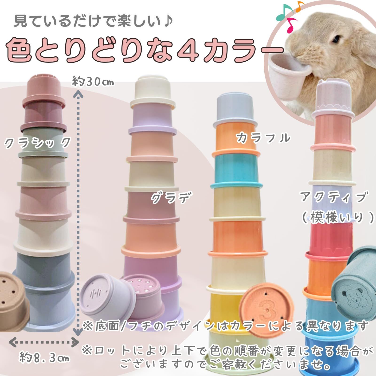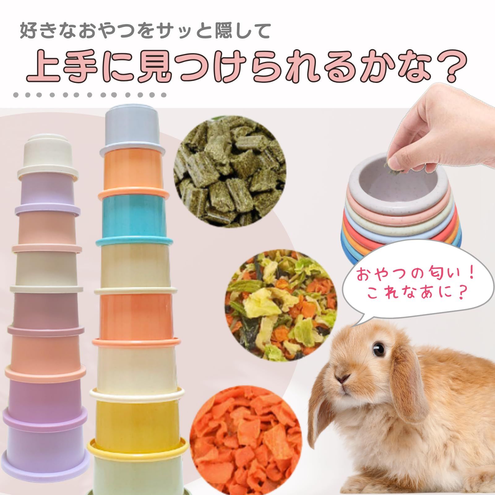 【しっかりしたフチと底面の匂い穴】くわえやすく匂いやすい設計で、うさぎさんが遊びやすい!大小8段セットで、積み重ねたりバラして使ったりと、工夫次第で遊び方が広がります。 ?