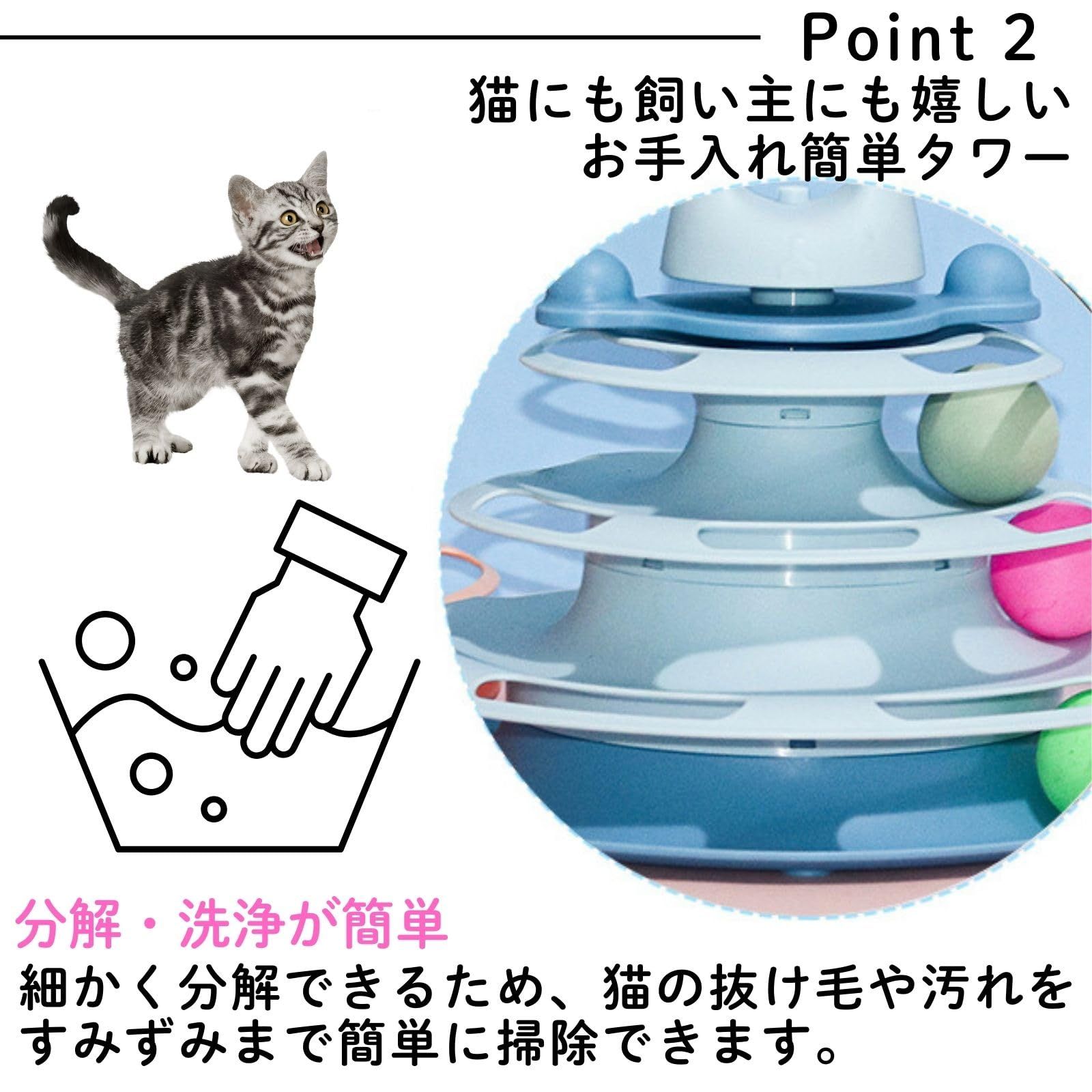 【飽きさせない工夫】各層にカラフルなボールが1つずつ、合計3つ内蔵されています。猫ちゃんが夢中になってボールを追いかけることで、狩猟本能を刺激し、知的好奇心を満たします。ボールは取り外し可能なので、交換もできます。