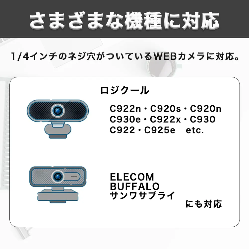 【対応機種】ロジクール:C922n・C920s・C920n・C930e・C922x・C930・C922・C925e / ELECOM、BUFFALO、サンワサプライ各機種に対応※1/4インチネジ穴がついている端末に対応しています。