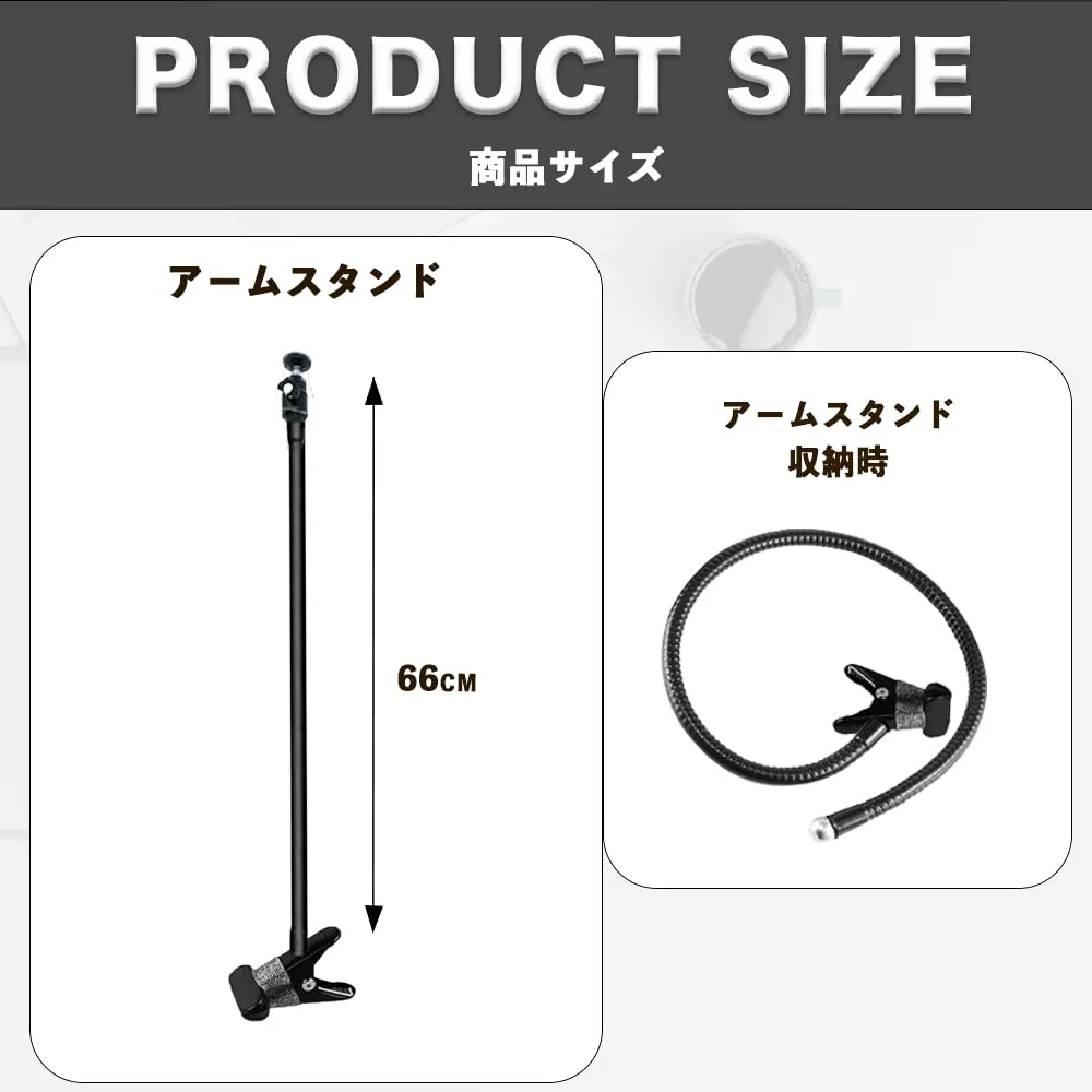 【66cmのロングアーム】長さ66cmのフレキシブルアームを採用しており機器をお好きな高さ、角度に自由にセッティングすることができます。アーム部分は硬めに仕上げており使用中にへたり曲がらない作りとなっております。