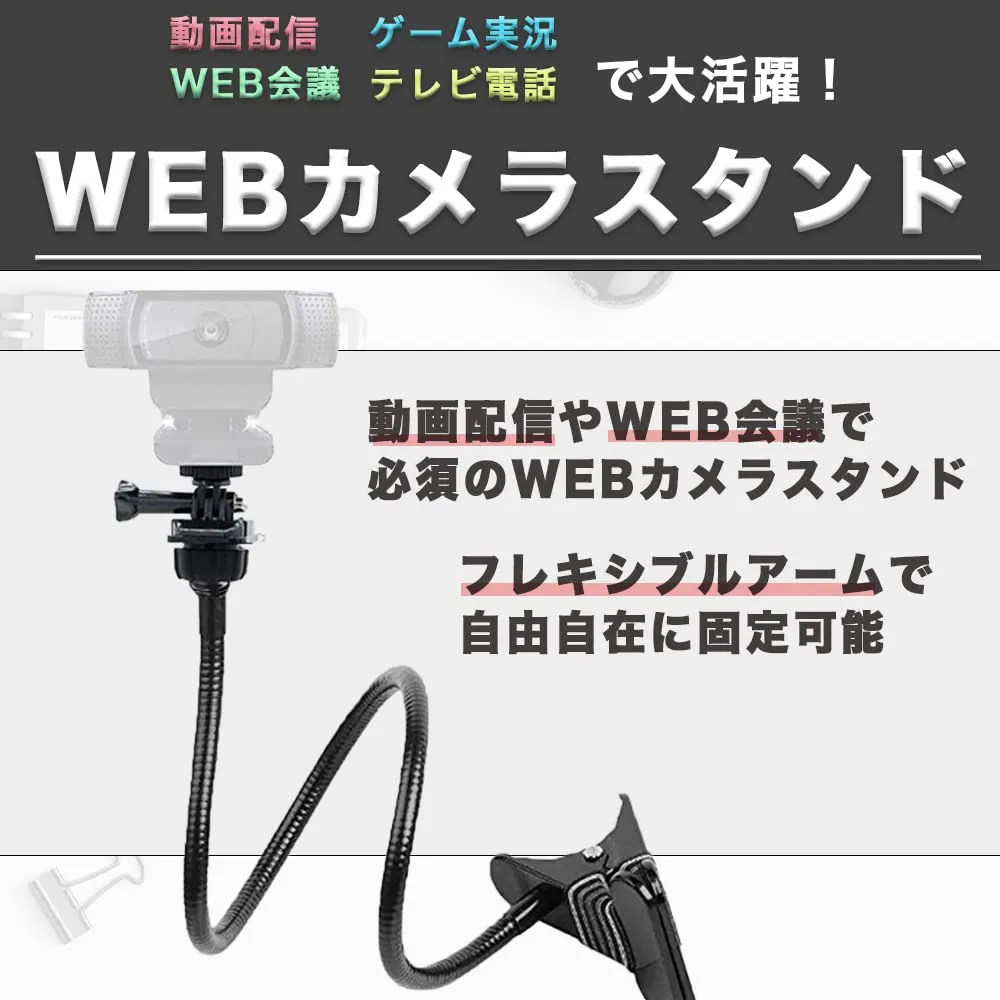 【自由自在のフレキシブルアーム】お使いのWEBカメラやデジカメをお好きな位置で固定できるフレキシブルアームスタンドです。最適な位置に自由に調整するできるのでWEB会議や動画撮影など様々な用途でご利用いただけます。