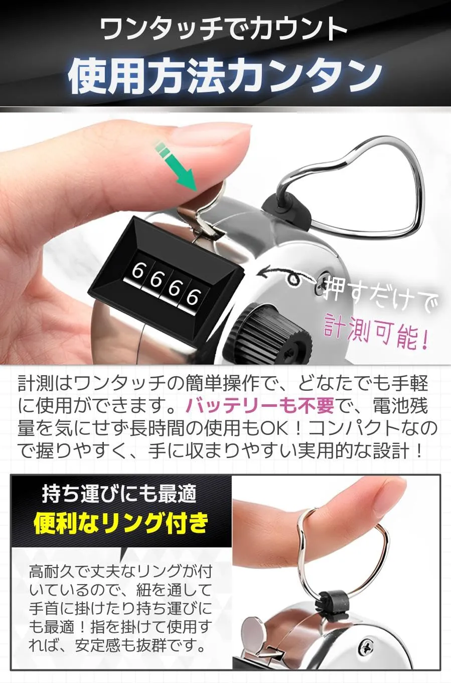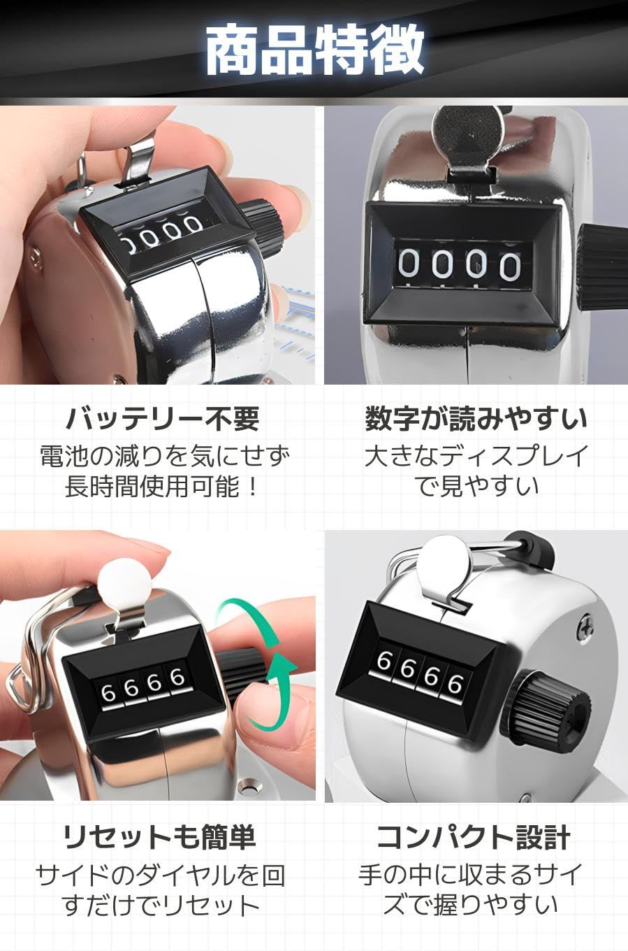 【商品特徴】①バッテリー不要:電池の減りを気にせず長時間使用可能!/②数字が読みやすい:大きなディスプレイで見やすい/③リセットも簡単:サイドのダイヤルを回すだけでリセット/④コンパクト設計:手の中に収まるサイズで握りやすい