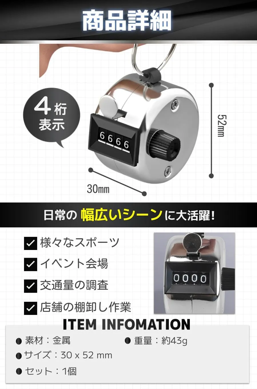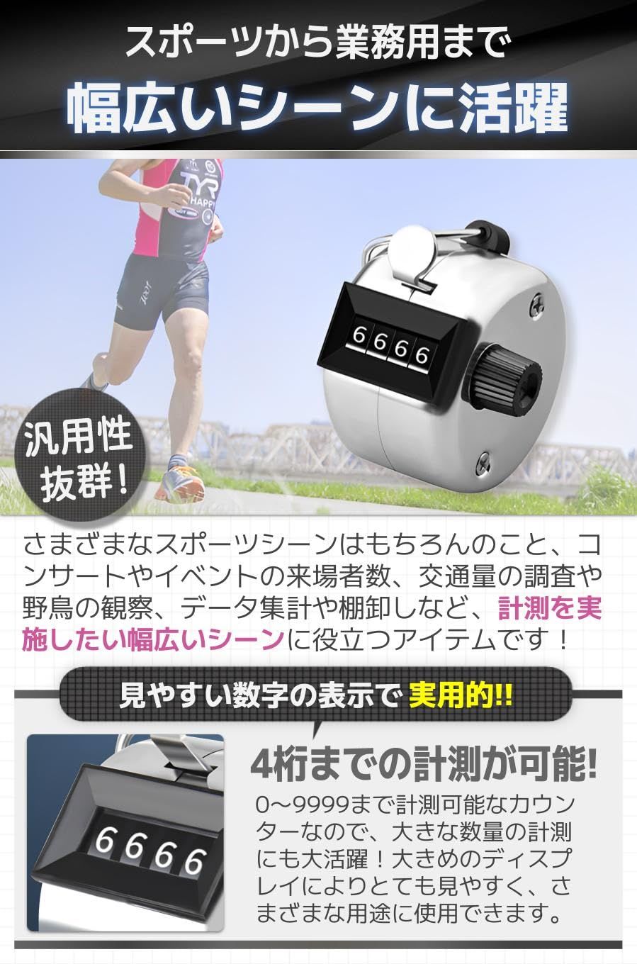 【幅広いシーンに活躍】さまざまなスポーツシーンはもちろんのこと、コンサートやイベントの来場者数、交通量の調査や野鳥の観察、データ集計や棚卸しなど、計測を実施したい幅広いシーンに役立つアイテムです!
