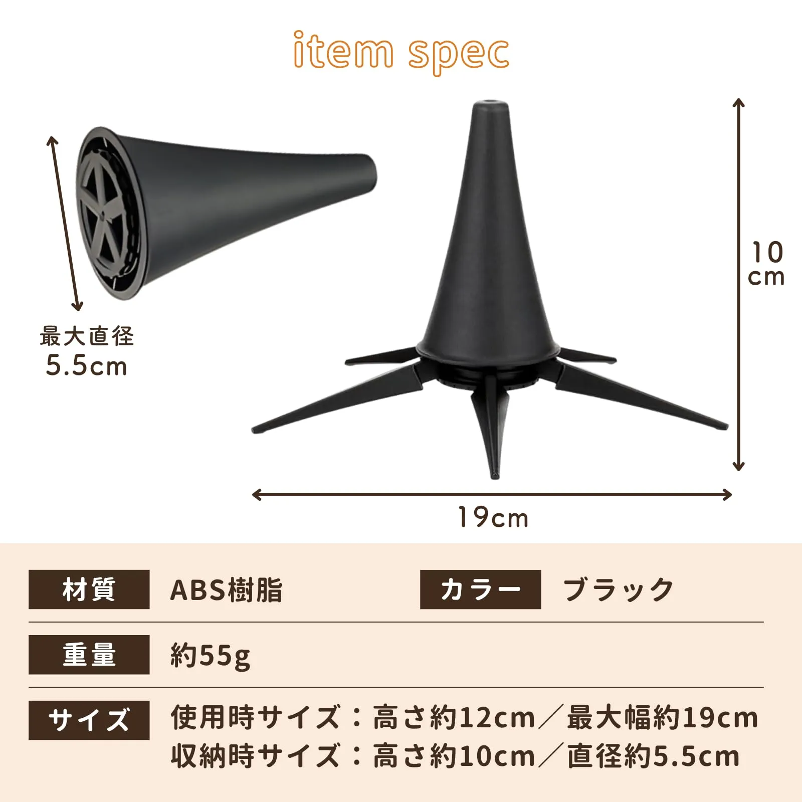 【製品仕様】使用時の最大幅は19㎝、高さは12㎝です。収納時の高さは10㎝、最大直径は5.5㎝で、重量は約55gです。 色 ブラック ブランド ideamall 形状 5本脚 メーカー 合同会社イデアモール ライザーの色 ブラック 最後までご確認頂き誠にありがとうございました。 ご確認頂き、ご購入いただけましたら幸いです。 何かご不明点などがございましたらお気軽にメッセージからお問い合わせ下さい。