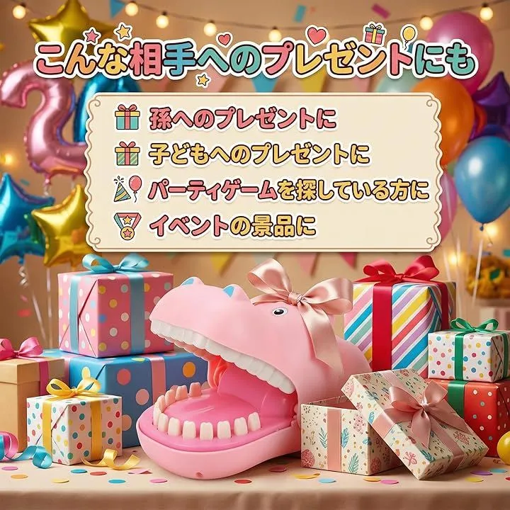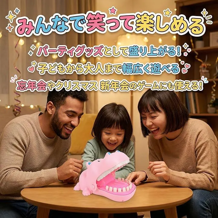 そっと歯を押して、ガブッとされたら負け。シンプルながら大人も子供も夢中になれる危機一髪 ゲームです。