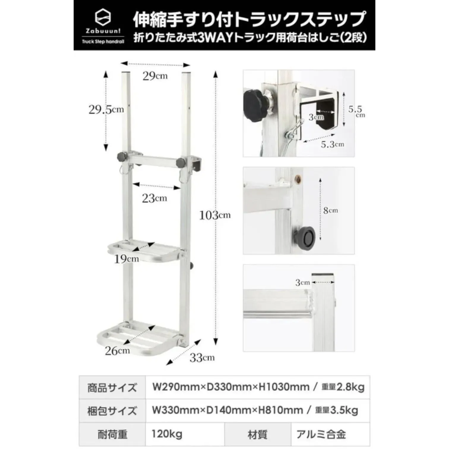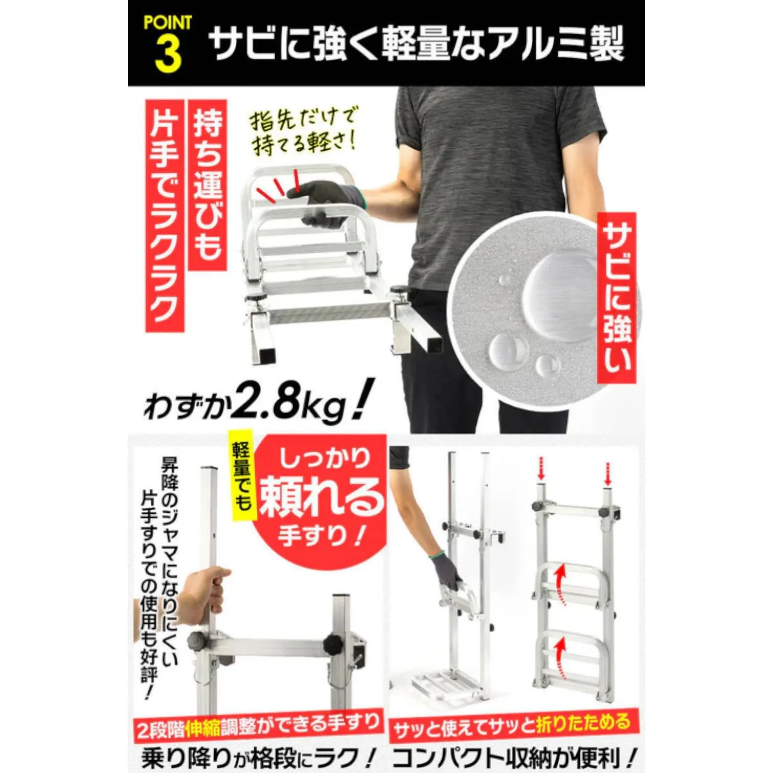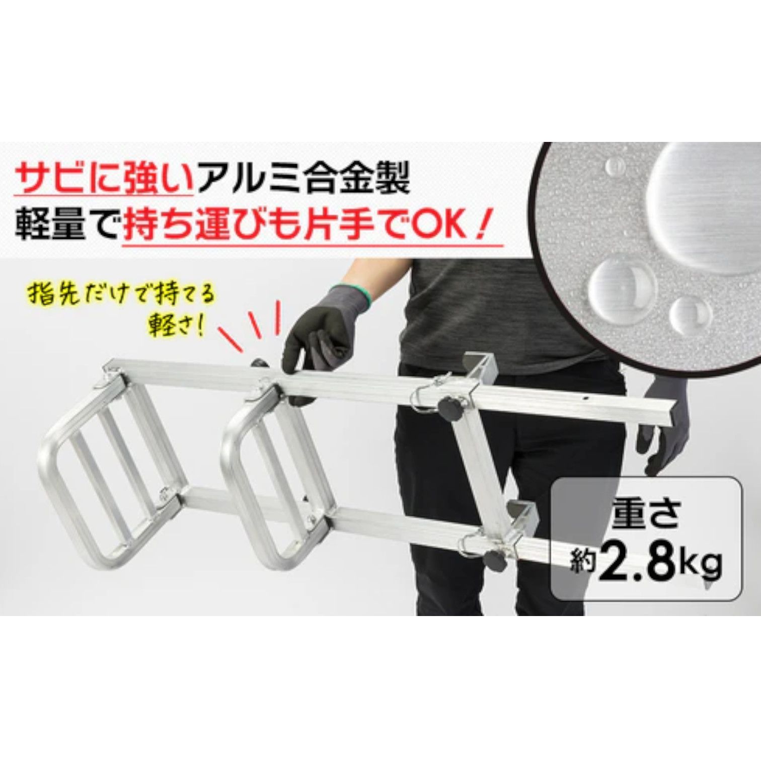 ■アルミ合金製でサビに強い 本体にはアルミ合金を採用しています。 耐荷重約120kgの強度を持ち、屋外での使用にも適したサビにくい仕様です。 軽量設計のため、持ち運びや取り扱いも簡単です。