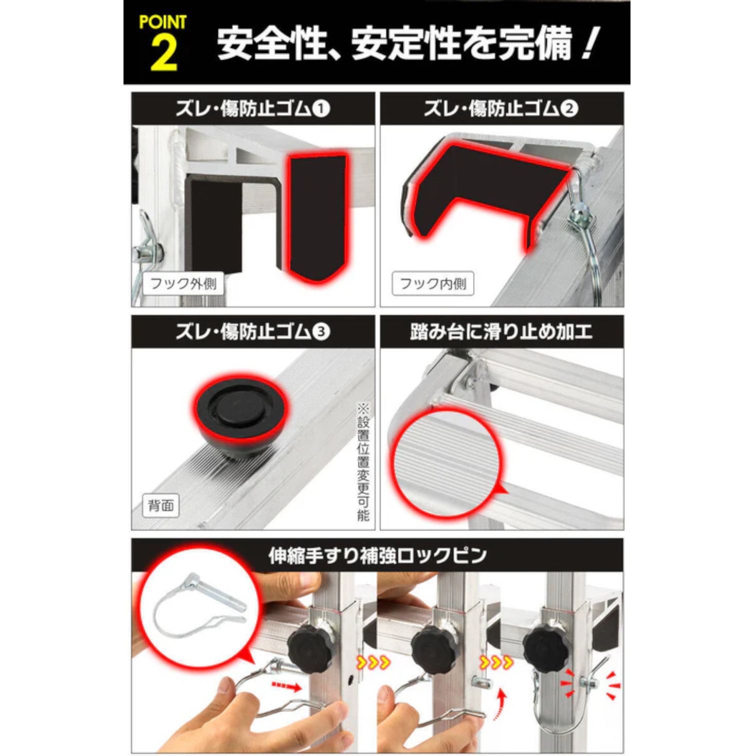 ■滑りにくく安全な設計 ステップ表面には溝加工を施しています。 足元が滑りにくく、安全に昇降が可能です。