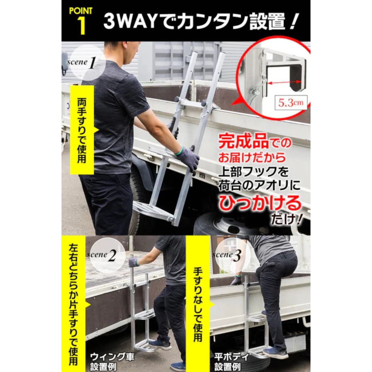 荷台への昇降をサポートする、軽量で扱いやすい折りたたみ式トラックステップです。