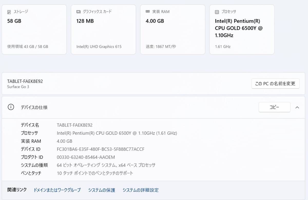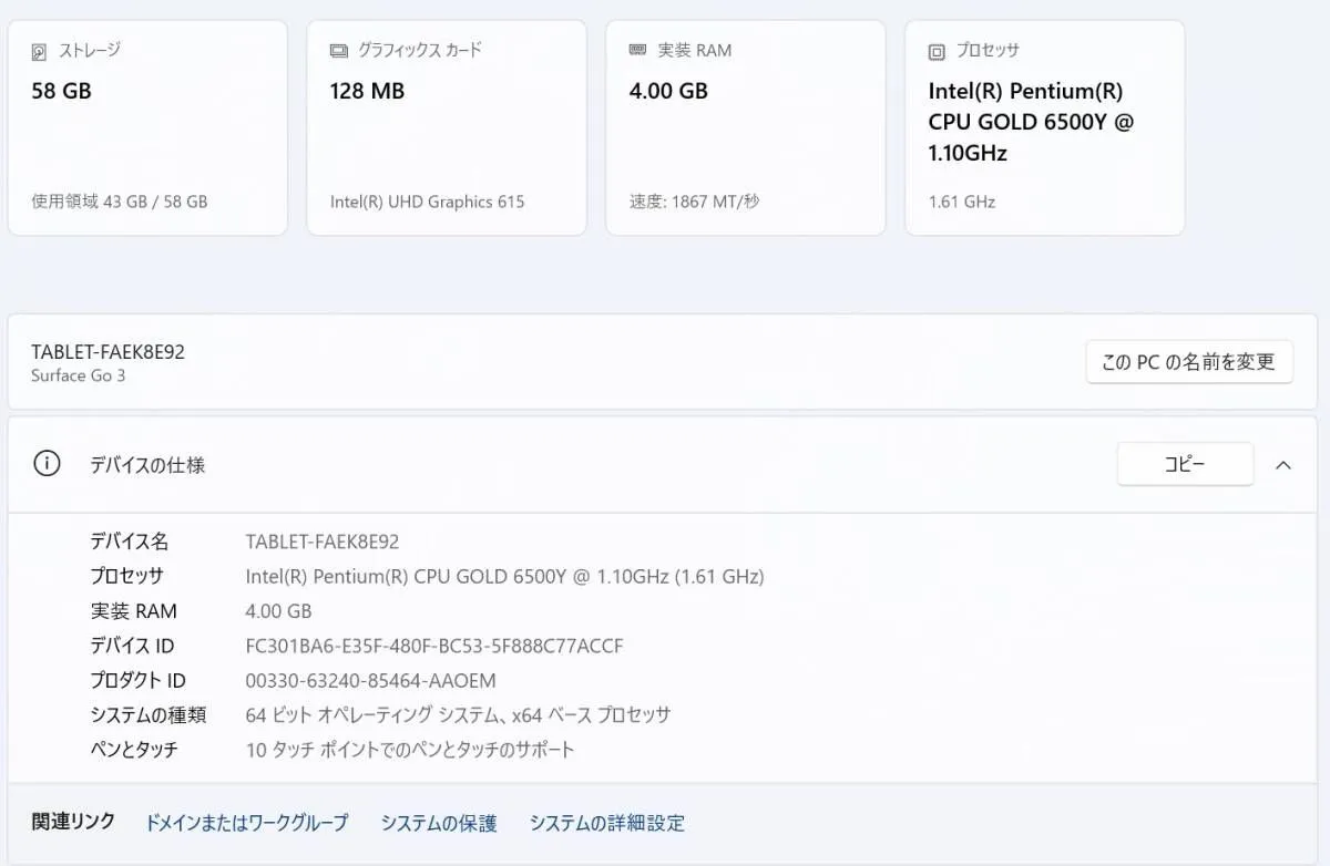 【仕様】 メーカー: Microsoft 型番: Surface Go 3 2022 (法人モデル) OS: Windows11Pro CPU: Intel Pentium Gold 6500Y @1.10GHz メモリ: 4GB 容量: eMMC 64GB 液晶: 10.5インチ バッテリー: 新品のため良好です ご覧いただきありがとうございます。 当店では全てアルコール清掃&動作確認済み。 ーーーーーーーーーーーーーーーーーーーー 初心者の方も安心してご使用いただけます♪ 初期設定済みのため、電源を入れてすぐにご利用可能です! こちらは