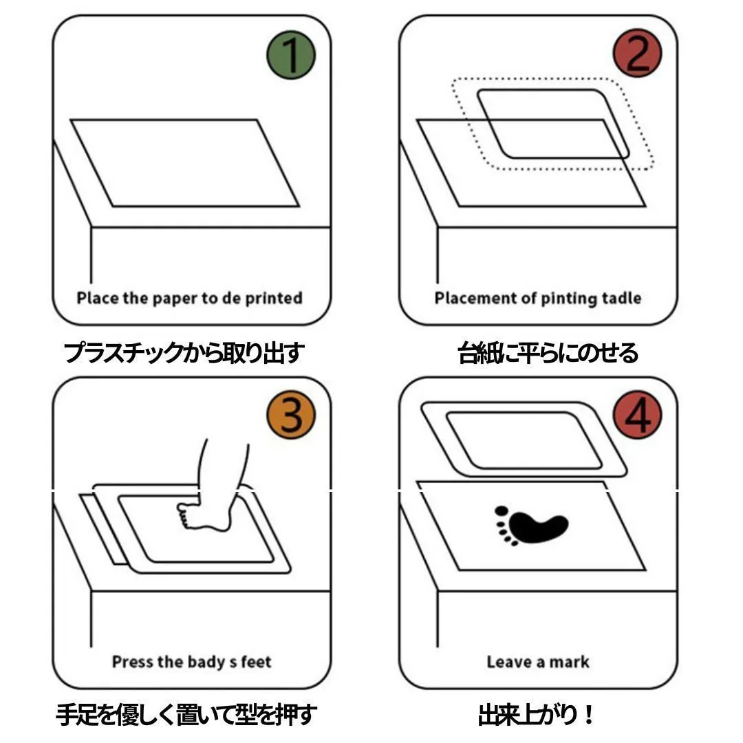 【使用方法】 (商品に説明書は付きませんので商品ページをご参照ください) 1.スタンプの下に台紙をセット ※スタンプ台は「Caution!」と書かれている面が台紙側に向けます。 2.お子様の手や足をスタンプ台枠内に収まるように優しく押し当てます。 3.スタンプ台を用紙から静かにはがします 4.インクを乾かして完成‼︎ ※インクは2〜3回使用できます(だんだん薄くはなっていきます)