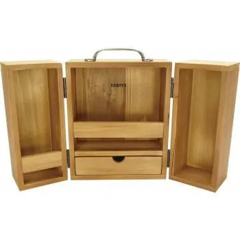 スパイスをおしゃれに収納、持ち運びできます。留め具を外して左右に開くキャビネットタイプです。スイング型の留め具のため簡単に開閉できます。3つのスペースに分かれています。中央上段はスパイスをディスプレイでき、下段は引き出しになっています。両サイドには高さのあるボトルを収納できます。