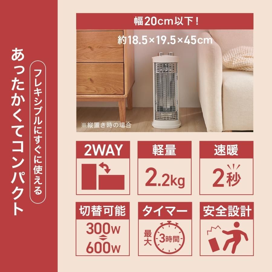 #3039 縦横 2way 電気 ストーブ カーボン ヒーター ベージュ 速暖2秒 300W 600W タイマー 縦置き 横置き 軽量 安全設計 遠赤外線 省エネ 小型 コンパクト 転倒オフ ※一部地域離島別途配送料有