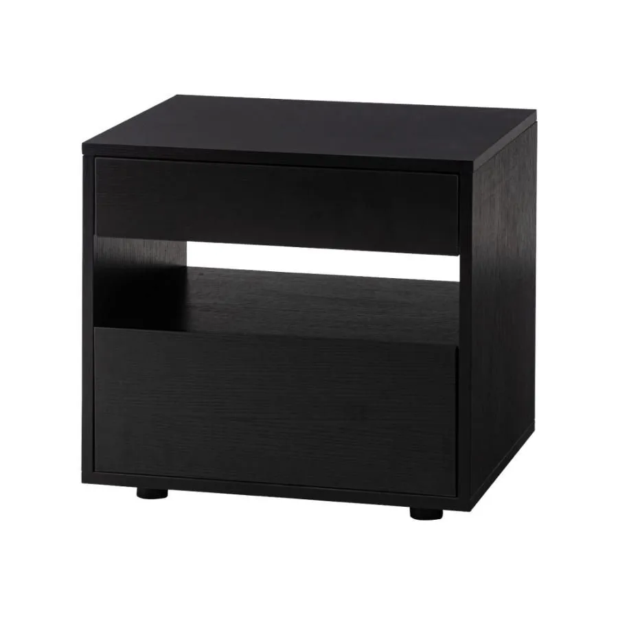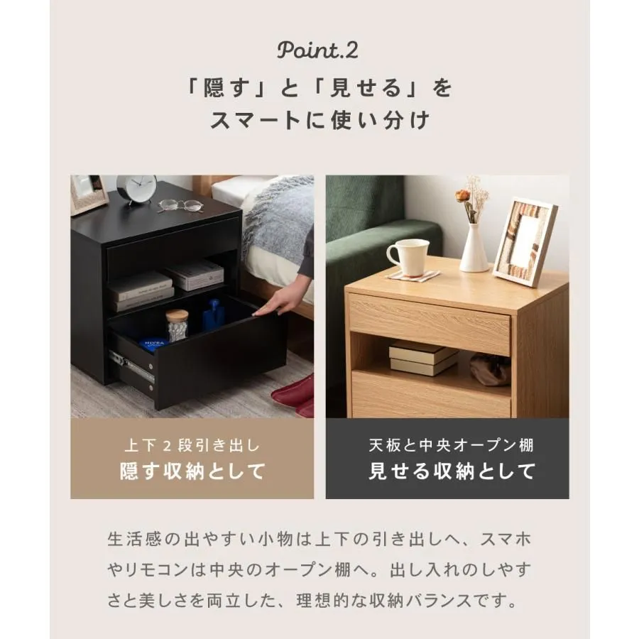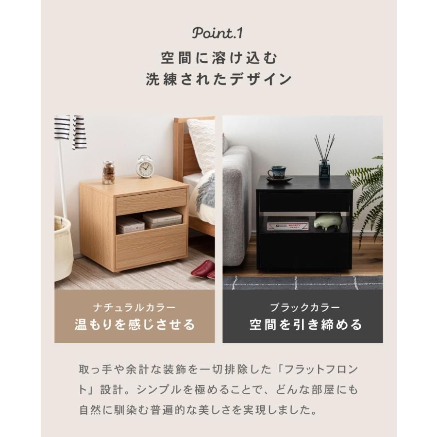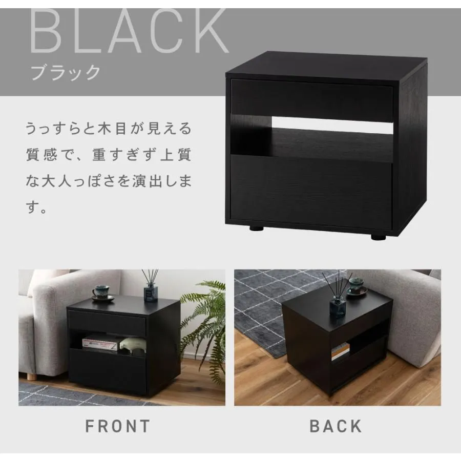 【検索キーワード】 サイドテーブル 引き出し付き 収納付き 木目調 幅50cm 高さ46cm 奥行40cm ナチュラル 黒 ブラック 北欧 シンプル おしゃれ モダン フラットフロント 取っ手なし サイドチェスト ゆったり
