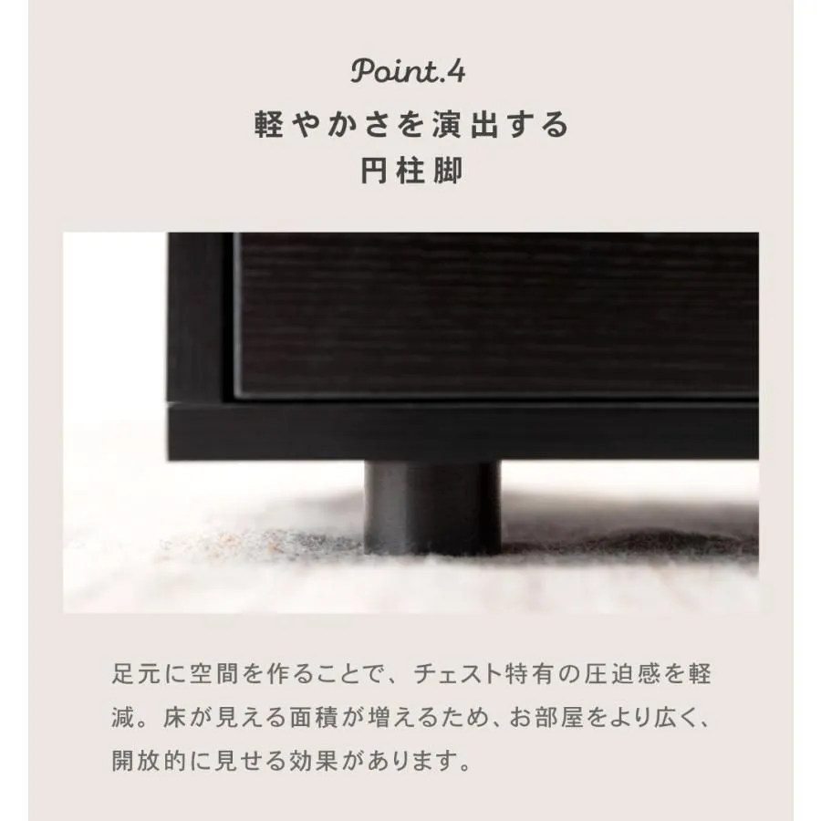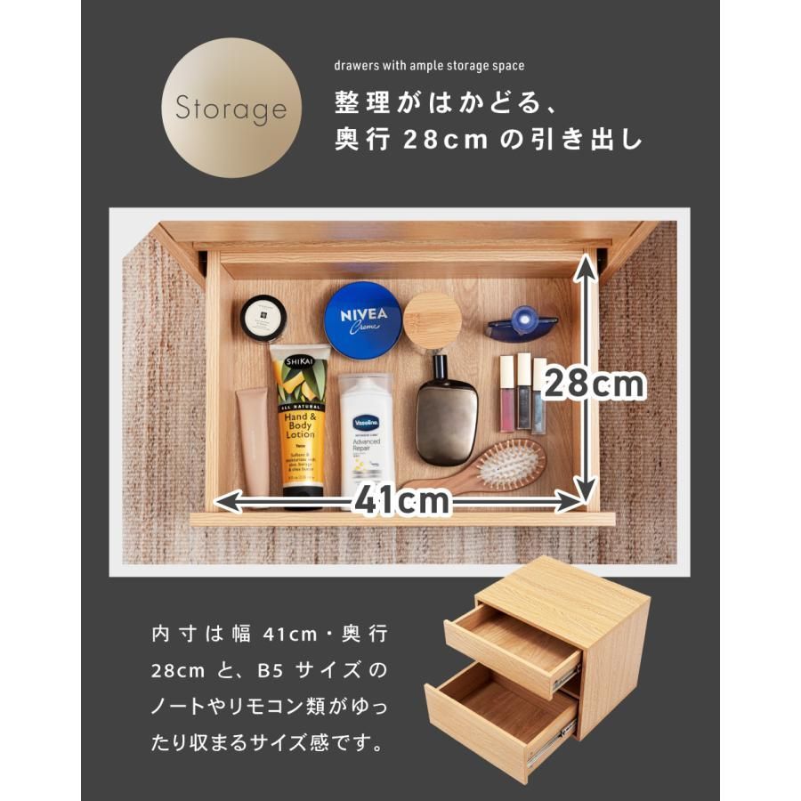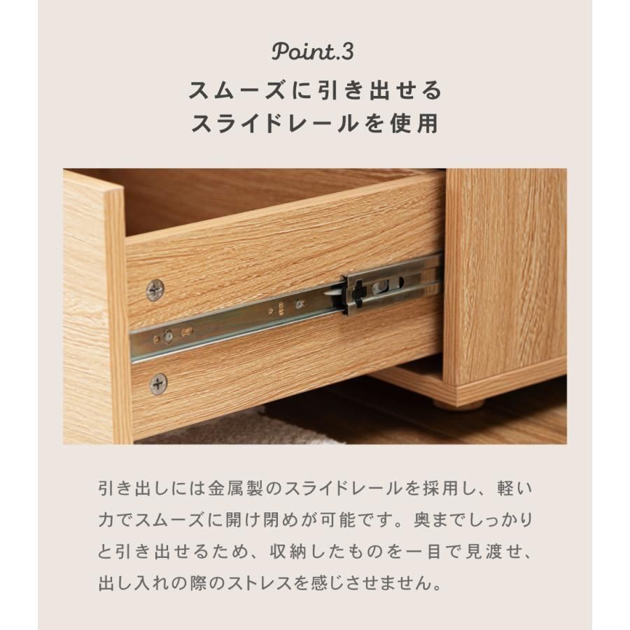 ●スムーズに引き出せるスライドレールを使用 引き出しには金属製のスライドレールを採用し、軽い力でスムーズに開け閉めが可能です。 奥までしっかりと引き出せるため、収納したものを一目で見渡せ、出し入れの際のストレスを感じさせません。