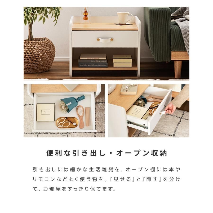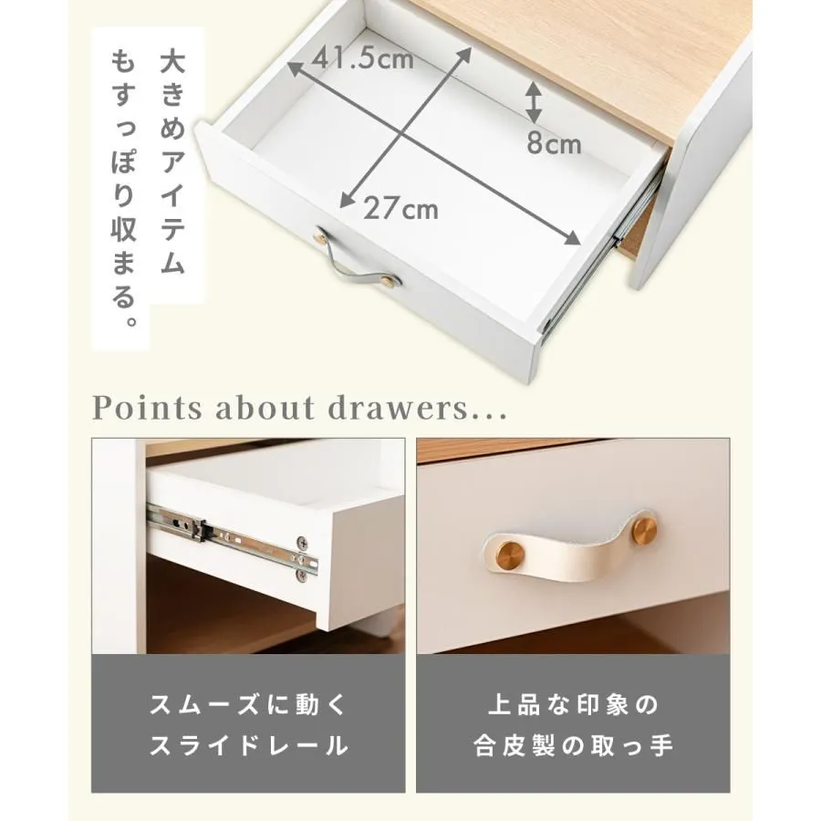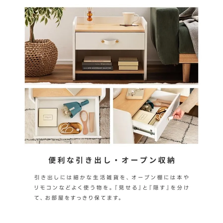 ●便利な引き出し・オープン収納 引き出しには細かな生活雑貨を、オープン棚には本やリモコンなどよく使う物を。 『見せる』と『隠す』を分けて、お部屋をすっきり保てます。 ・スムーズに動くスライドレール ・上品な印象の合皮製の取っ手