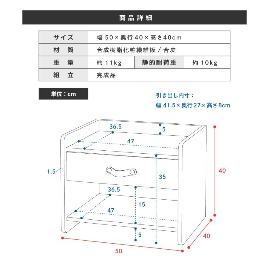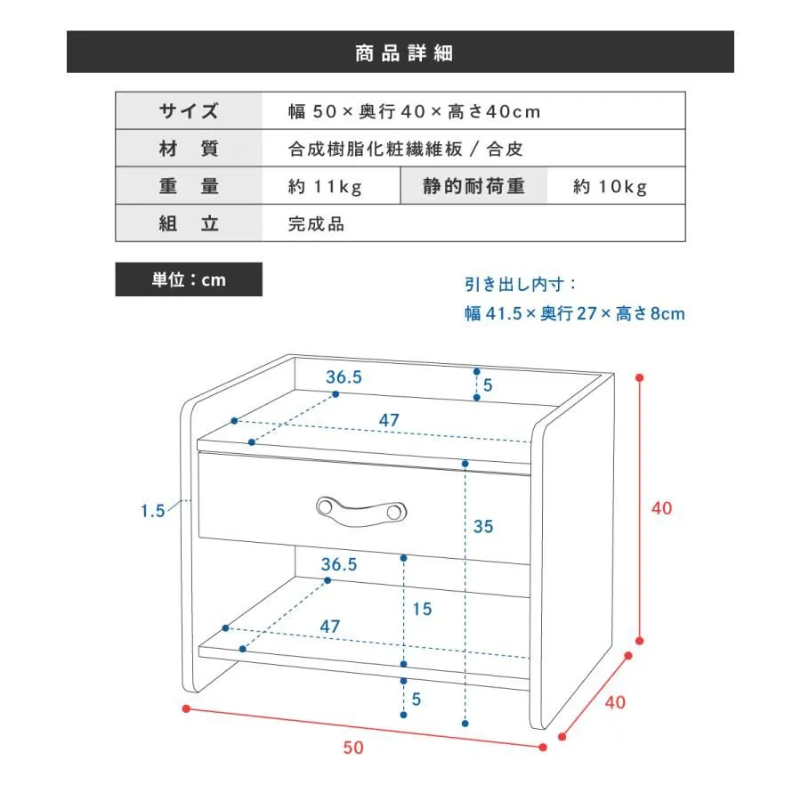 サイドテーブル 高さ40cm 引き出し 完成品 組立不要 幅50cm サイドチェスト 木目調 収納 ナイトテーブル ベッドサイドテーブル サイドテーブル 北欧 ナチュラル