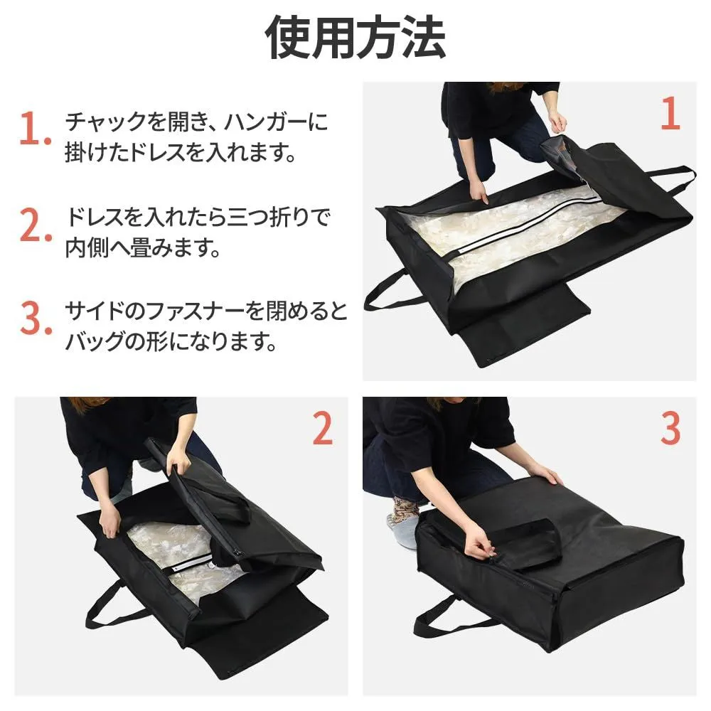 三つ折りにして、ファスナーで閉じればバッグの形になります。 ファスナーを開けておけば、ドレスカバーとしてもお使いいただけます。
