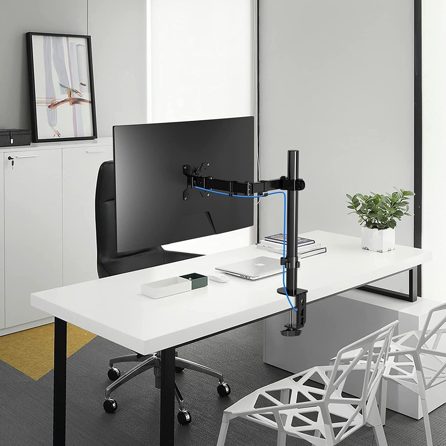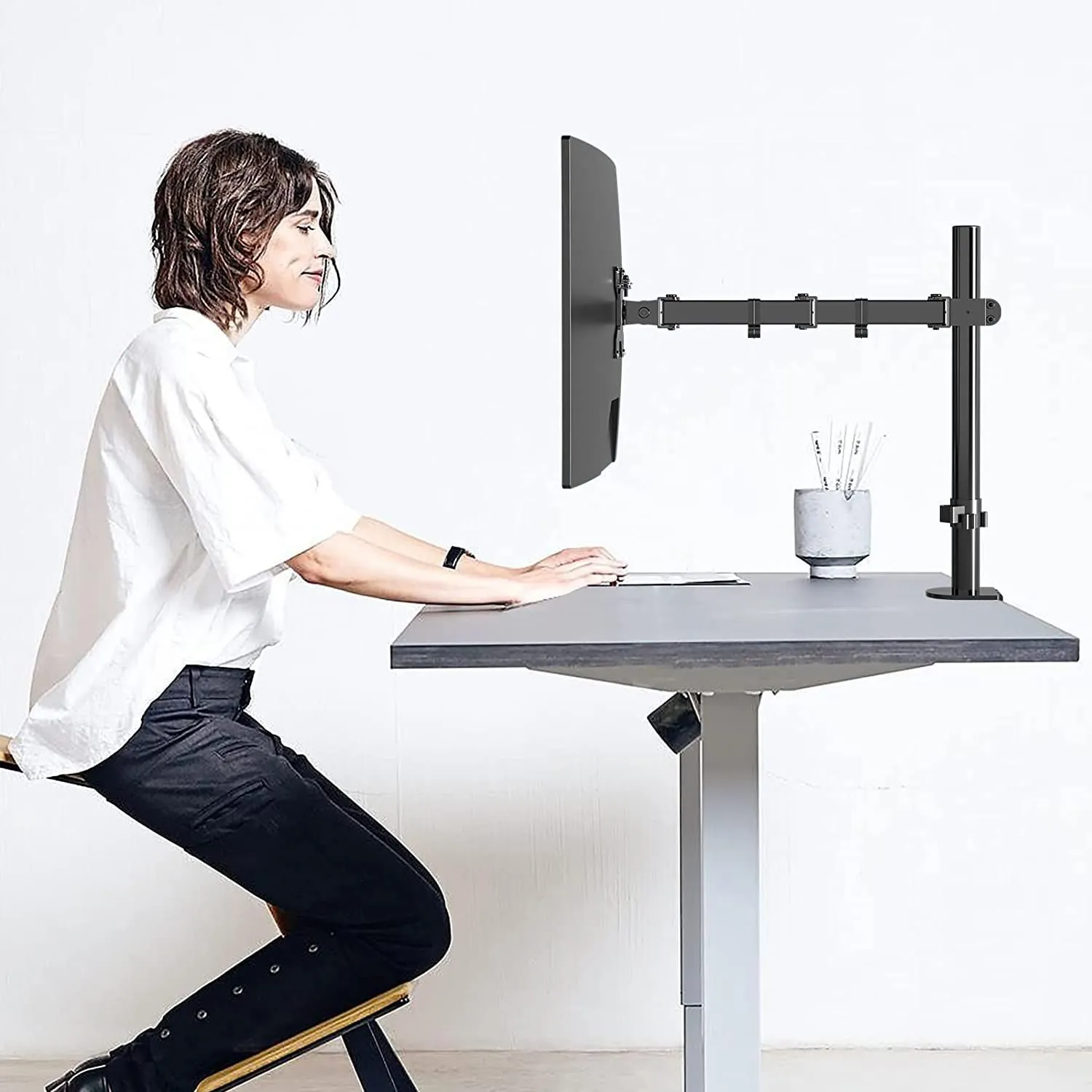 【猫背対策】こんなお悩みありませんか?モニター位置が低く、姿勢が悪く、肩こりや腰痛が起こる?このモニターアームはいろんな角度を調整できて自由度は高いです。さらに、立てで仕事もできます。角度や距離などが自分に合わせるにして、背や首の疲れをリラックスします。活動範囲が広くて便利です。どんな姿勢でも液晶画面が見れて、目の疲れを軽減でき、作業効率が上がります。 5.