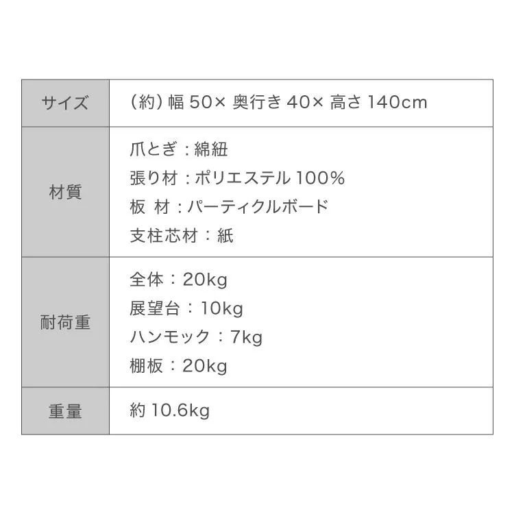 【耐荷重】 全体:20kg 展望台(ベッド):10kg ハンモック:7kg 棚板:20kg ※商品によって若干の誤差(約1~2cm)が生じる場合がありますこと予めご了承ください。 ※商品の仕様は予告なく変更になる場合がございます。 ※商品の色味はモニターの機種や設定により実際の商品と異なる場合があります。 予めご了承ください。 ※生産ロットにより、同じカラーでも多少の色差があることがございます。ご了承ください。