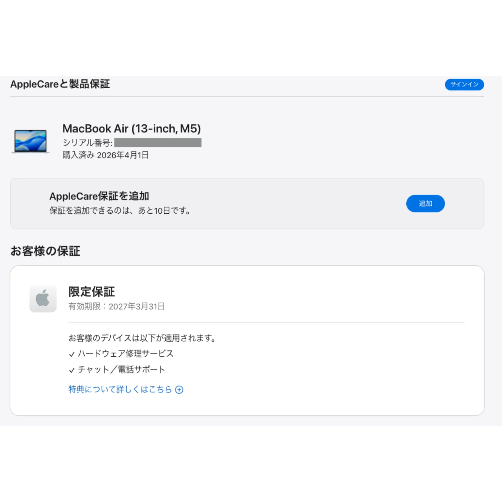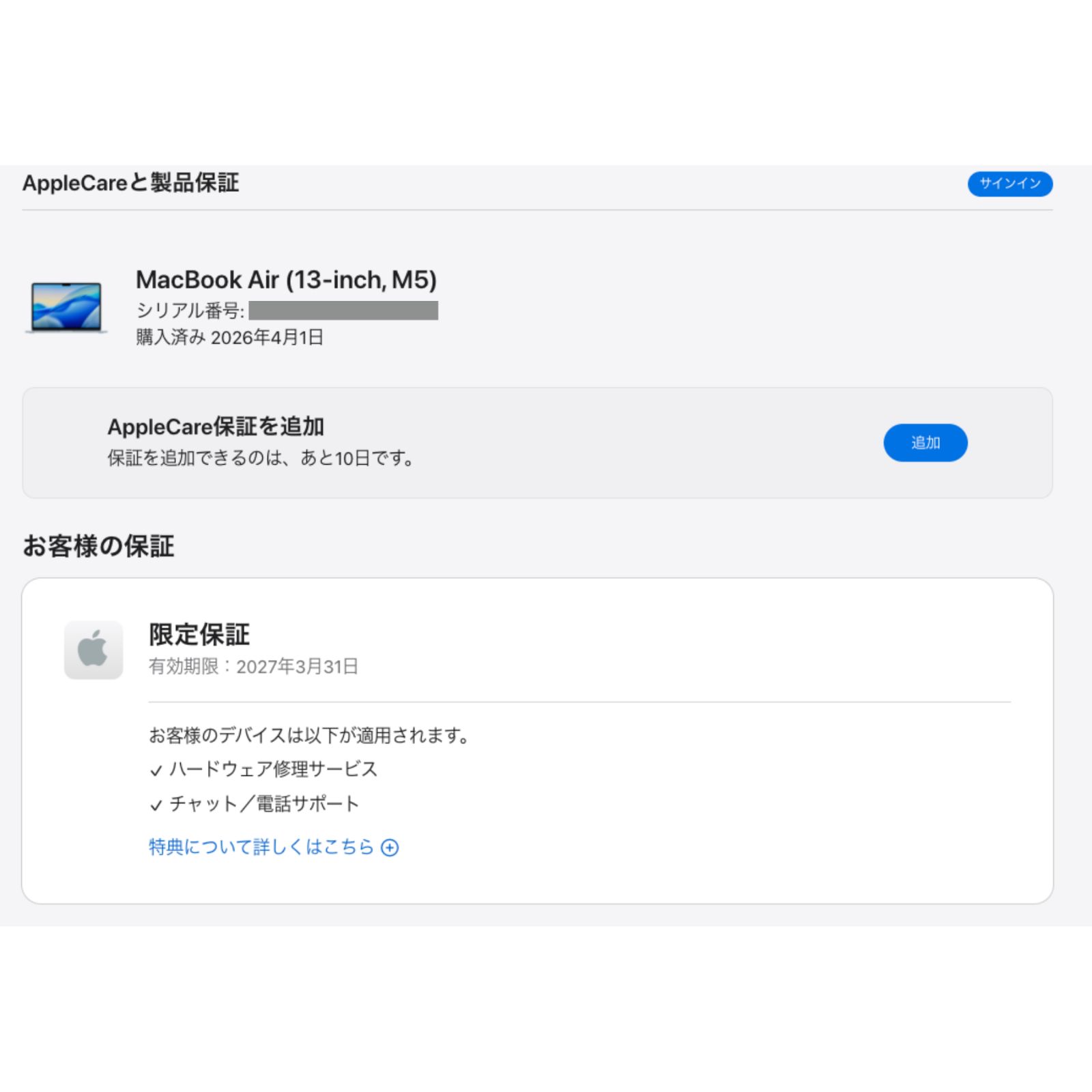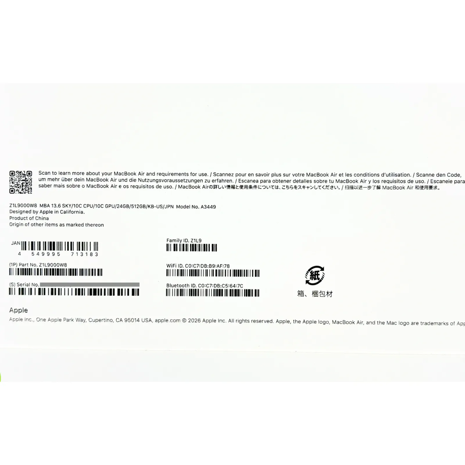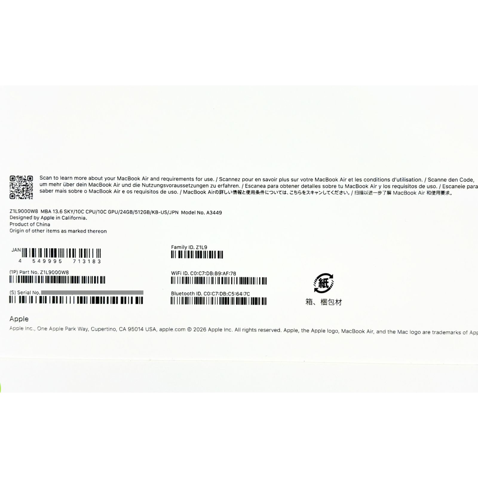【新品未開封】 MacBook Air 13.6インチ M5 A3449 24GB 512GB 2026年製 SKY